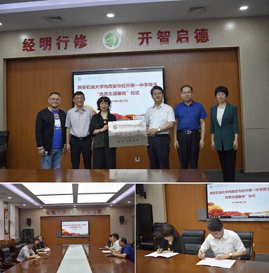 2019年5月27日,经济管理学院院长王君萍、财务处副处长聂朝恩、教师陈丁一行前往西安市经开第一中学,就共建“优秀生源基地”事宜举行座谈,并进行优秀生源基地授牌仪式。