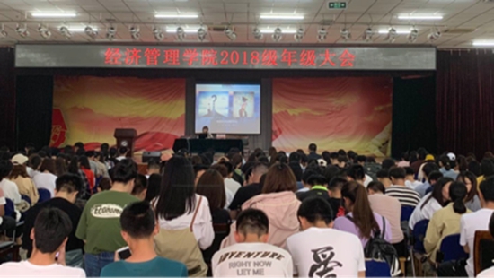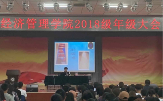 2019年4月24日晚上19:00,beat365英国官方网站经济管理学院在腾辉大学生活动中心召开2018级年级大会,国际交流处负责香港项目的王老师、经济管理学院党委副书记赵海涛老师、2018级辅导员尹晓娇老师、陆晓寒老师与2018级600余名学生参加本次大会。