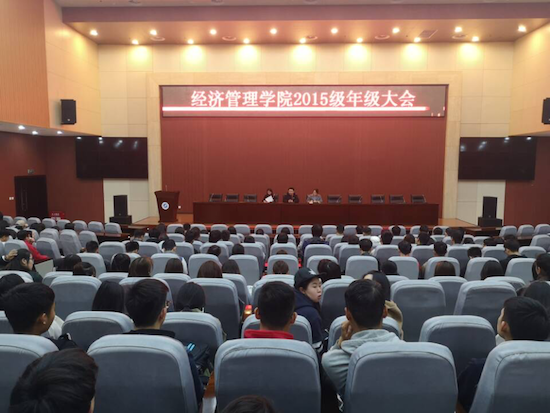 2019年3月15日上午10点,经济管理学院在鄠邑校区弘石报告厅召开2015级年级大会,会议由2015级学生辅导员王晓天老师主持,学院学生管理办公室主任刘冰老师、辅导员宋亚文老师出席,2015级全体学生参加。