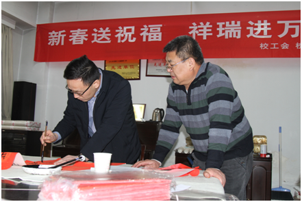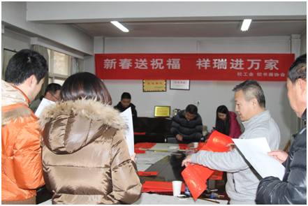 2019年1月14日,农历己亥新年来临之际,由校工会和校书画协会组织的“新春送祝福 祥瑞进万家”送春联活动在校工会会议室进行,来自beat365书画协会的三位书法爱好者现场为beat365教职工义务书写春联,送上校工会对全体教职工的新春祝福。校党委副书记、校书画协会会长雷西合也从百忙之中来到现场为大家书写春联,beat365教职工、离退休职工纷纷前来,现场欢声笑语,一片祥和景象。