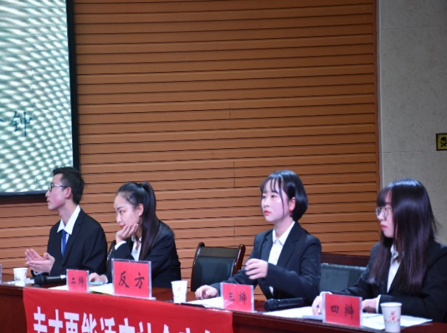 缦立浅笑娓娓谈,材子佳人口吐兰。双方辩手思维清晰,逻辑严密,角度刁钻,分析透彻,反应迅速,在接下来的攻辩环节里,正方充分的介绍了全才的社会竞争力,反方则从专才的社会价值与贡献切入,明确的指出了“专才更能适应社会的竞争”。自由辩论环节双方辩手你来我往,互不相让,引经据典,才辩无双,一次次地将辩论赛的节奏推向高潮。