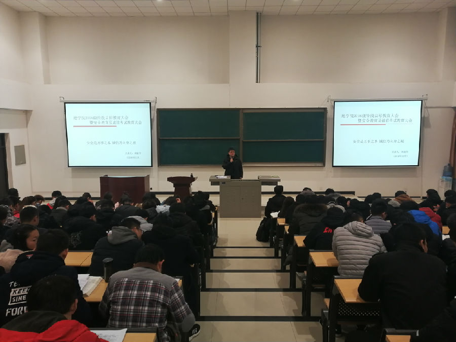 为进一步提升在校大学生稳定安全意识和诚信考试意识,提升大学生突发事件应对能力,扎实推进学生稳定安全教育和诚信考试教育工作,12月9日晚,地球科学与工程学院2016级在鄠邑校区石工地科楼115教室举行安全教育暨诚信考试教育大会,辅导员周毅华老师主持会议,2016级全体同学参加会议。