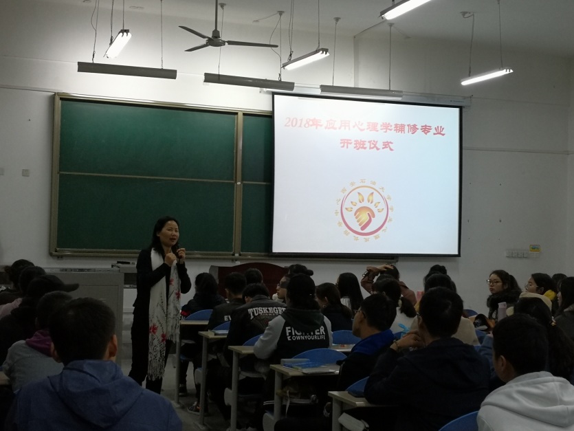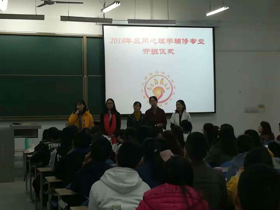 11月5日晚7点,beat365“油缘”心理2018年应用心理学辅修专业开班仪式在鄠邑校区教学楼B 108教室举行。教务处副处长易和平、学生心理成长指导中心全体教师、近百名参加辅修专业的学生参加。仪式由学生心理成长指导中心主任肖琼主持。