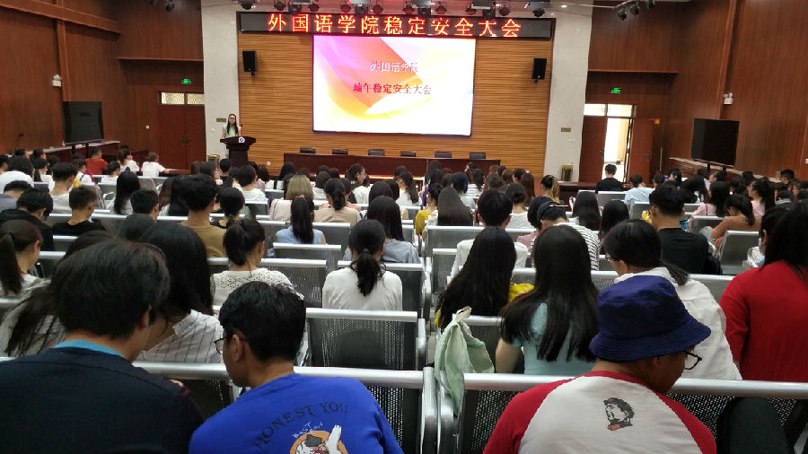 6月14日下午4:00,我院于三号院系楼就业指导中心举行端午节前稳定安全大会,本次大会主讲人为外国语学院2016级辅导员李洋甜老师,我院16级、17级全体学生按时到场。