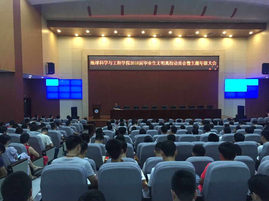 6月13日下午2:00,地球科学与工程学院在鄠邑校区弘石学术报告厅举行毕业生文明离校动员大会。辅导员李化杰老师主持大会,学院2018届全体毕业生参加了此次会议。