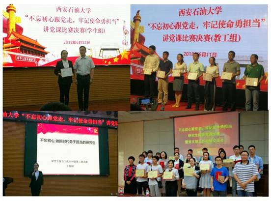 ——促进工作,坚持融合。在开展专题学习和落实三会一课制度中,研究生院党委坚持以促进工作,学做融合为原则,要求研究生党建工作为研究生学术实践和稳定安全教育提供思想保证和动力支持。2018年5月至今,在各研究生党支部积极带动,研究生党员模范带头下,研究生院超额完成互联网+创新创业大赛报名工作,研究生在石油装备创新设计大赛、研究生电子设计竞赛、陕西省研究生创新成果展报名积极,并石油工程设计大赛等学科竞赛中获得全国二等奖2项、三等奖3项。在稳定安全教育中,充分发挥党支部战斗堡垒作用和研究生党团骨干作用,结合研究生在学习生活中关注的热点难点,开展研究生宿舍管理服务专题座谈会;结合“525心理健康教育月”,开展宣传倡议、印发手册、现场咨询、科普展览、电影评析、问卷调查、主题讲座等系列活动;结合毕业生文明离校,开展毕业生初入职场系列讲座、毕业篮球赛、毕业生党员座谈会、主题征文等,进一步强化党员身份意识,宗旨意识,切实增强党员荣誉感,责任感,使命感,为进一步加强研究生思想政治教育和积极推进研究生党建工作做出自身更大的贡献。