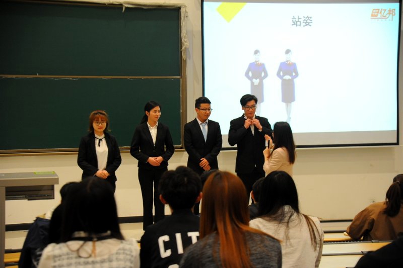 在接下来与四位学生干部的现场互动中,代老师以诙谐幽默的语言指出他们在仪容、着装礼仪、站姿坐姿礼仪、社交礼仪方面存在问题,并通过和现场同学的交流互动,生动形象的为各位同学讲述了社交礼仪的一些非常实用且必须注意的原则规范,希望各位同学能够加强社交礼仪的自我修炼,不时赢得同学们的阵阵掌声。大家认真听取代老师的讲解,不时的记录笔记、回答问题,整场讲座氛围热烈,各个环节有序进行。