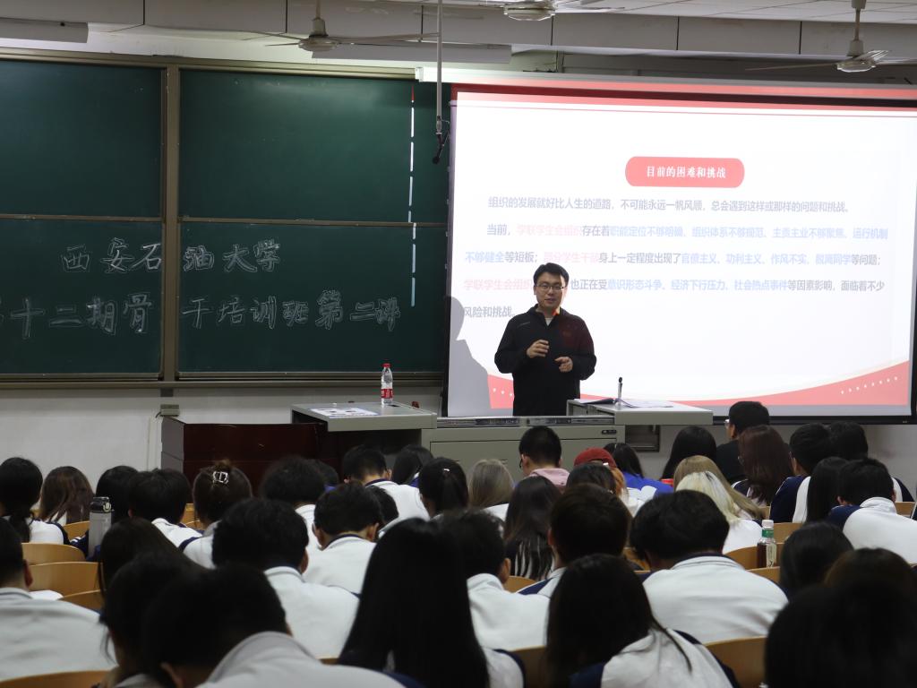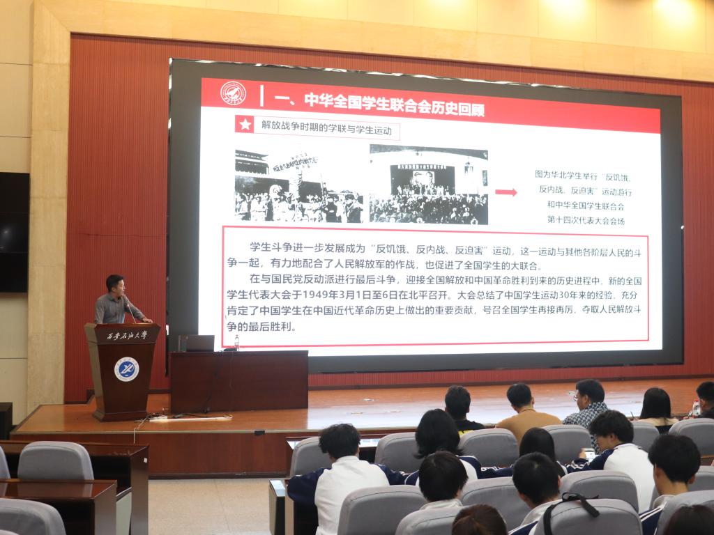 4月10日晚,省学联主席、西北工业大学研究生会执行主席白怡暄在弘石报告厅,以《以“青春之力”守正创新,坚定书写学生干部赶考新答卷》为题,从学联历史回顾、党和国家对青年和学联学生会组织的要求、新时代学联学生会组织如何做到“全心全意服务同学”等方面进行了详细的讲解,并结合自身学习与工作经历,勉励广大学生干部积极围绕思想引领、学业发展、身心健康、社会融入、权益服务和校园文化等方面开展工作,团结凝聚广大石油学子积极投身社会主义现代化建设的火热实践。