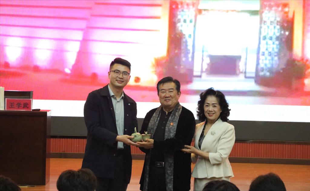 王学武首先对中国唯一以五代后周皇帝“柴荣”姓氏命名的御窑瓷器——柴窑的历史起源、修复保护、文化传承等方面进行了讲解。他指出,柴窑作为古代“五大名窑(柴汝官哥定)”之首,距今已有1000多年,柴荣皇帝曾御批柴窑为“雨过青天云破处,这般颜色做将来。”,具有“青如天、明如镜、薄如纸、胎如玉、声如磐”的特点,被誉为“诸窑之冠”,尊称为“中国瓷皇”。其次,他对自上世纪90年代开始,本人与夫人寇玉徽放弃原有工作,一起从西安城建中挖掘出现的碎瓷片,开始踏上了抢救保护研究传承柴窑的艰辛路程,以及于2009年在文物部门大力支持下,创建集柴窑文物抢救征集、修复保护、收藏研究等为一体的西安柴窑文化博物馆的初心使命与奋斗历程进行了介绍,勉励广大同学要坚定文化自信,积极学习中国传统优秀文化,勇于担当社会责任,努力成为具有高度文化自信的新时代好青年。最后,他与现场同学进行了互动交流,对大家提出的问题逐一进行了解答。