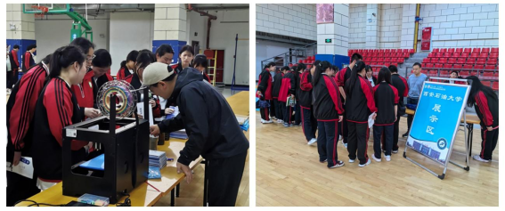 科技节活动现场,体育学院姜国平、实验室管理处贺刚两位老师将携带的富有学校学科、科研特色的3D打印机、岩心标本、原油标本、煤样标本等展品展示在科技节展会现场。同学们对参展作品十分感兴趣,对展品的工作原理、获取来源、实际用途等问题进行询问,两位老师现场给同学们进行了详细讲解。