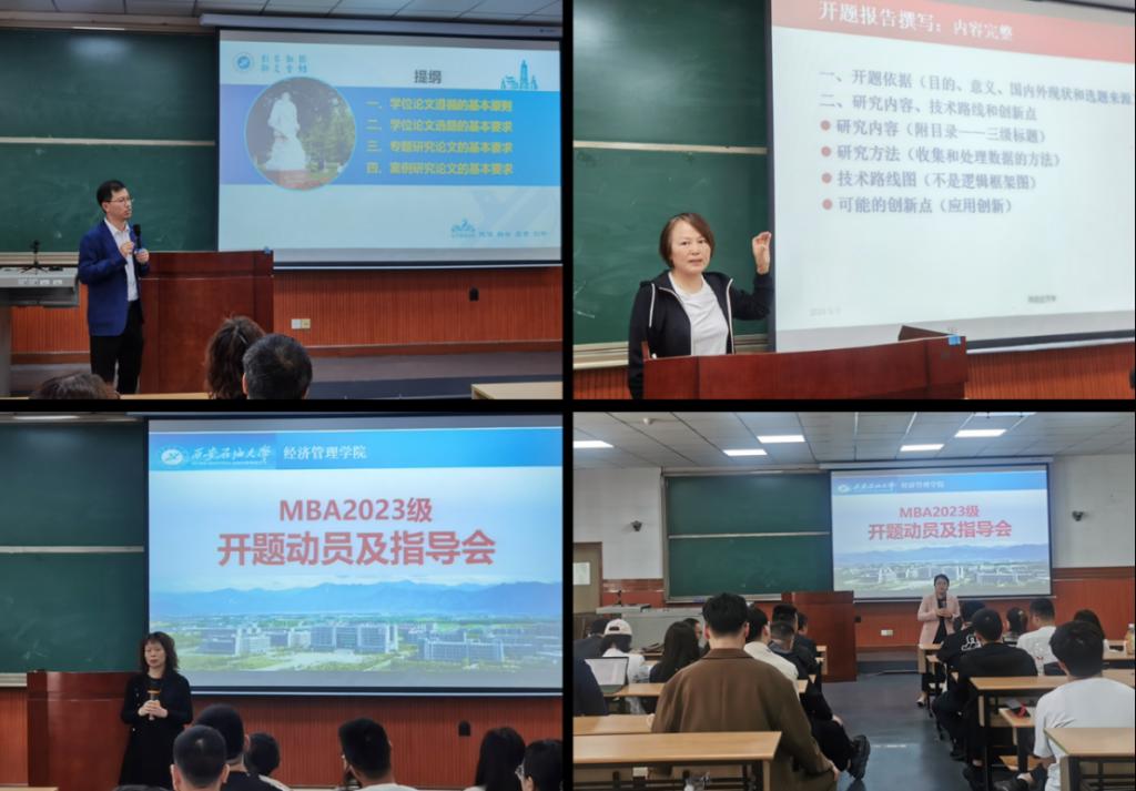 为提升工商管理硕士(MBA)学位论文质量,帮助2023级MBA同学解决论文开题过程中的疑难问题,beat365MBA教育中心于5月1日上午在雁塔校区东阶202教室举行了学位论文开题动员和指导活动。经济管理学院院长王君萍教授、副院长李春霄副教授、MBA导师吴文洁教授、MBA教育中心负责人黄莉副教授对2023级MBA同学进行了现场指导。