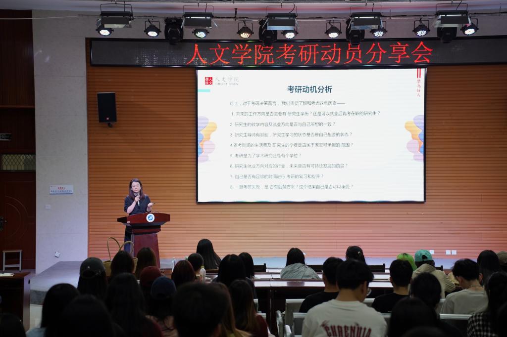 为提升学院人才培养质量,提高学生就业竞争力,充分调动学生考研积极性,营造浓郁学习氛围,5月13日下午,人文学院于鄠邑校区崇文楼就业指导中心多功能厅举办2021级年级大会暨考研动员分享会。会议由人文学院党委副书记盛丹主讲,学工办主任付强、2021级辅导员张馨元和2021级全体学生到场参会。