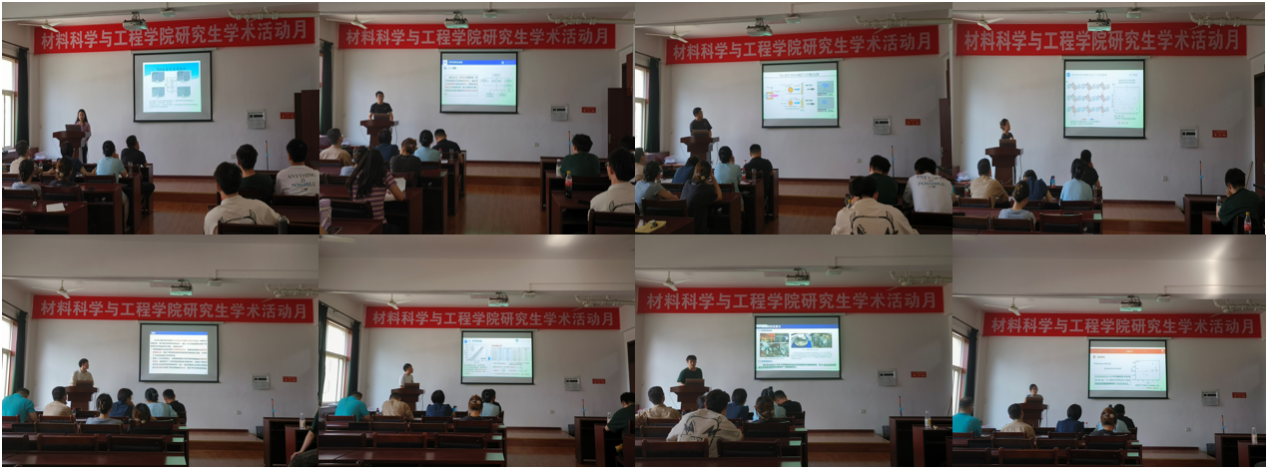 2021级研究生薛力源、王苗、李志如、郑书权、杨培智,2022级研究生肖世俊、张国栋、张乐乐,分别作了题为《N2分压对ZrN涂层取向和摩擦腐蚀行为及机理的影响》《S-O间非共价相互作用对非稠环受体分子光电性质的影响研究》《光诱导氧空位Bi2O2(OH)NO3的制备及其光催化性能研究》《丙烯酰甘氨酸离子凝胶的制备及在人体运动监测中的应用》《TC4钛合金混合制造结合区组织形成机制与性能调控》《强制冷却下大直径薄管板残余应力及变形分析》《大气等离子喷涂NiCrB沉积行为研究》《TiAl合金亚稳组织析出调控及高温氧化行为研究》的报告。