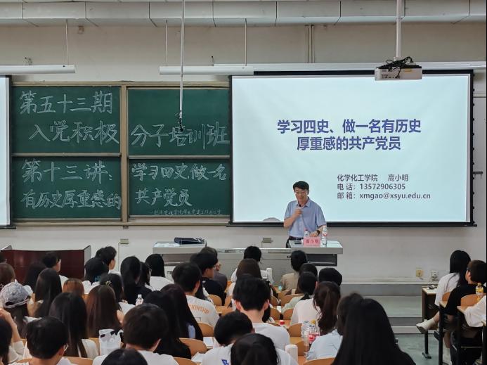 为加强党史、国史、改革开放史、社会主义发展史教育,弘扬以爱国主义为核心的民族精神和以改革创新为核心的时代精神,5月22日,经济管理学院第五十三期入党积极分子培训班第十三讲于鄠邑校区博览楼239教室举行。本次党课由化学化工学院党委书记高小明主讲,第五十三期全体入党积极分子参加。