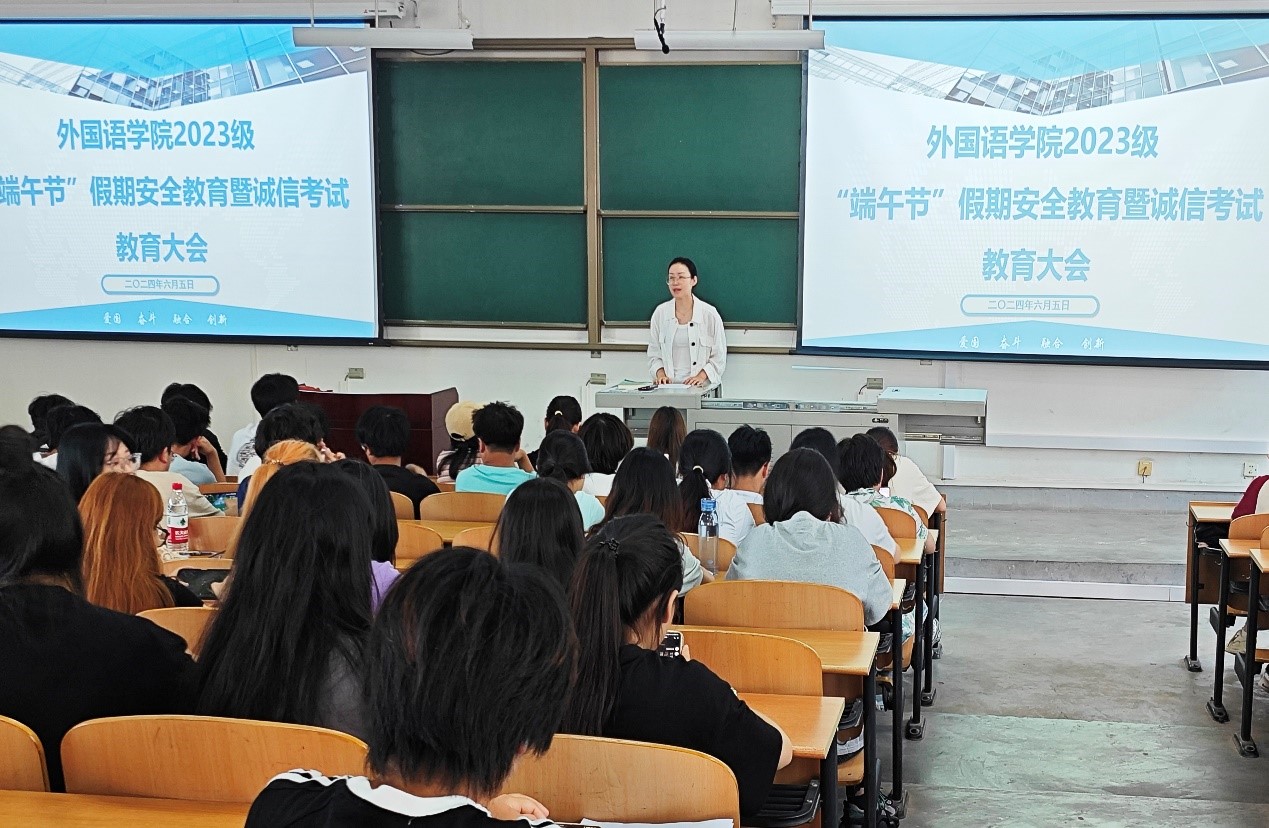 为提高学生安全防范意识,进一步加强学风建设,严肃考风考纪。外国语学院各年级分别于6月5日-6日召开端午假期安全教育暨诚信考试教育大会。