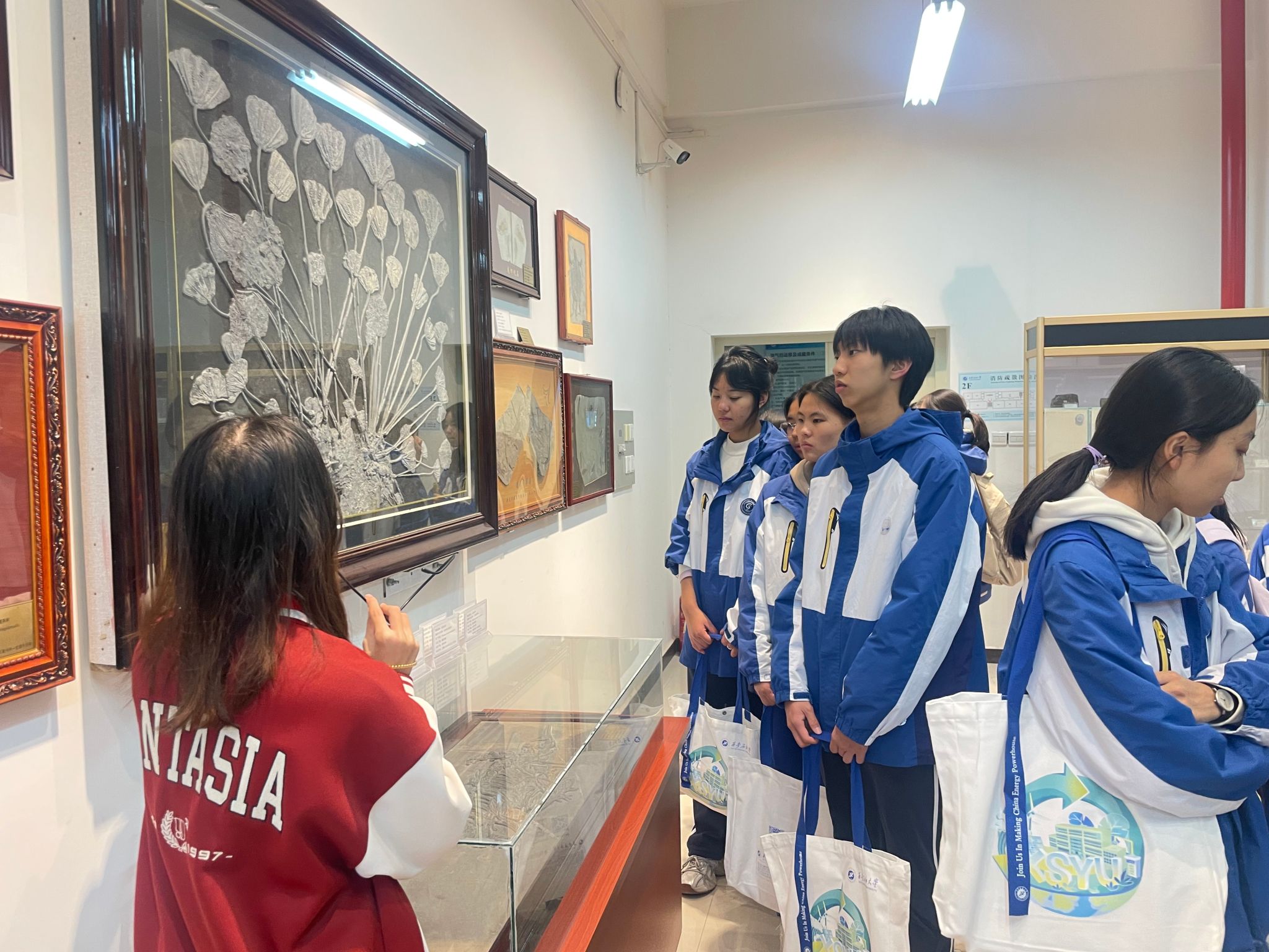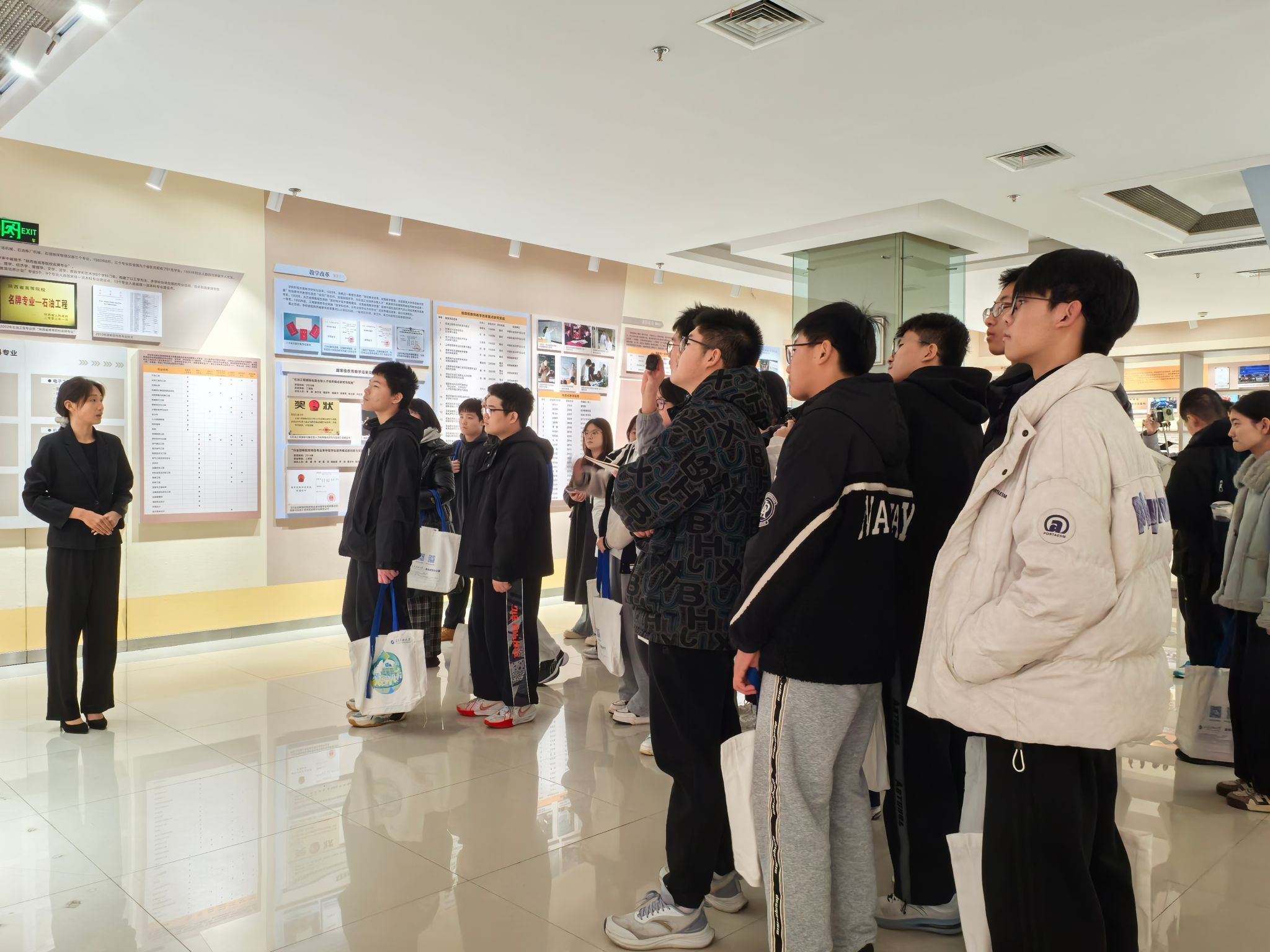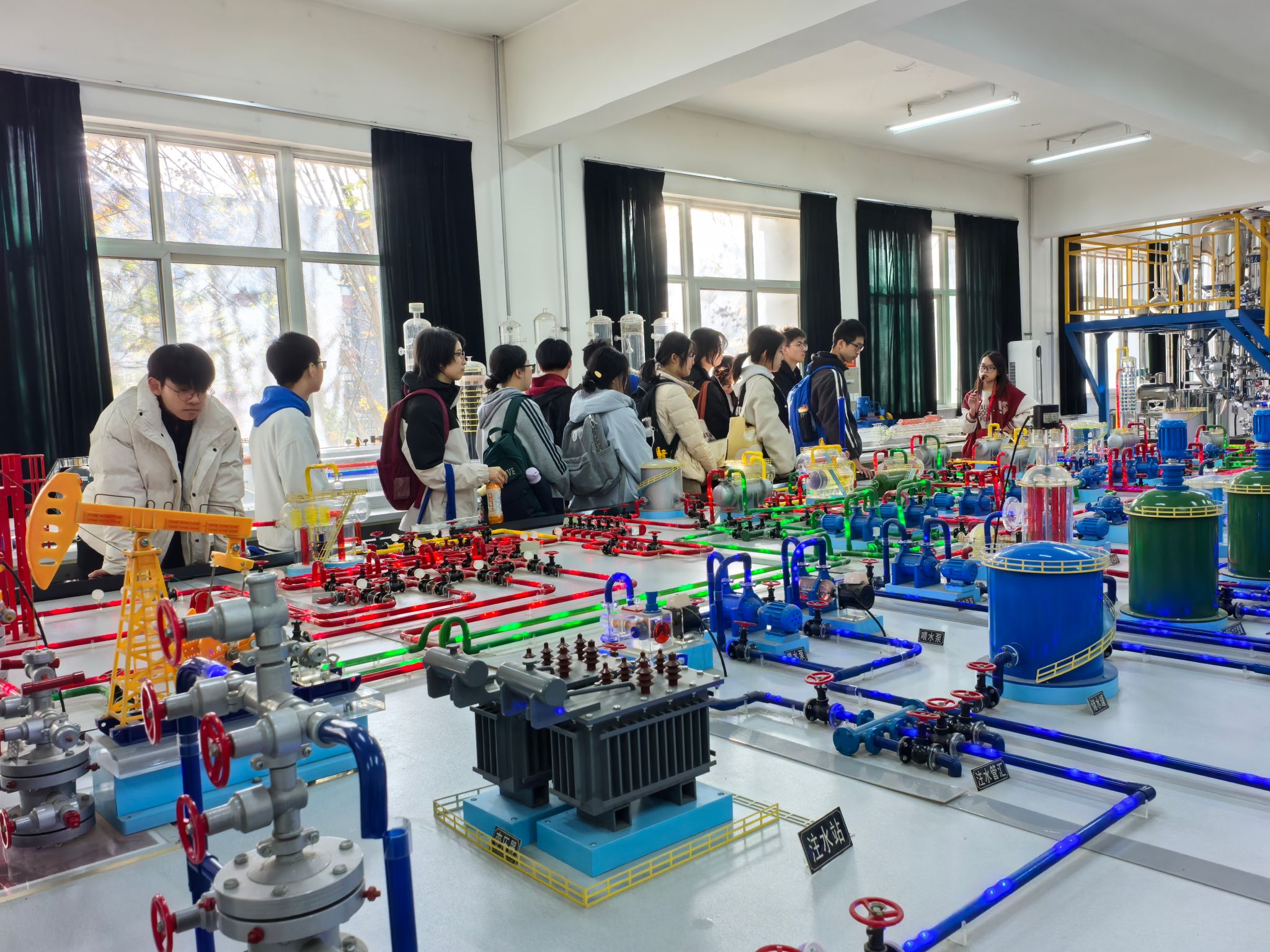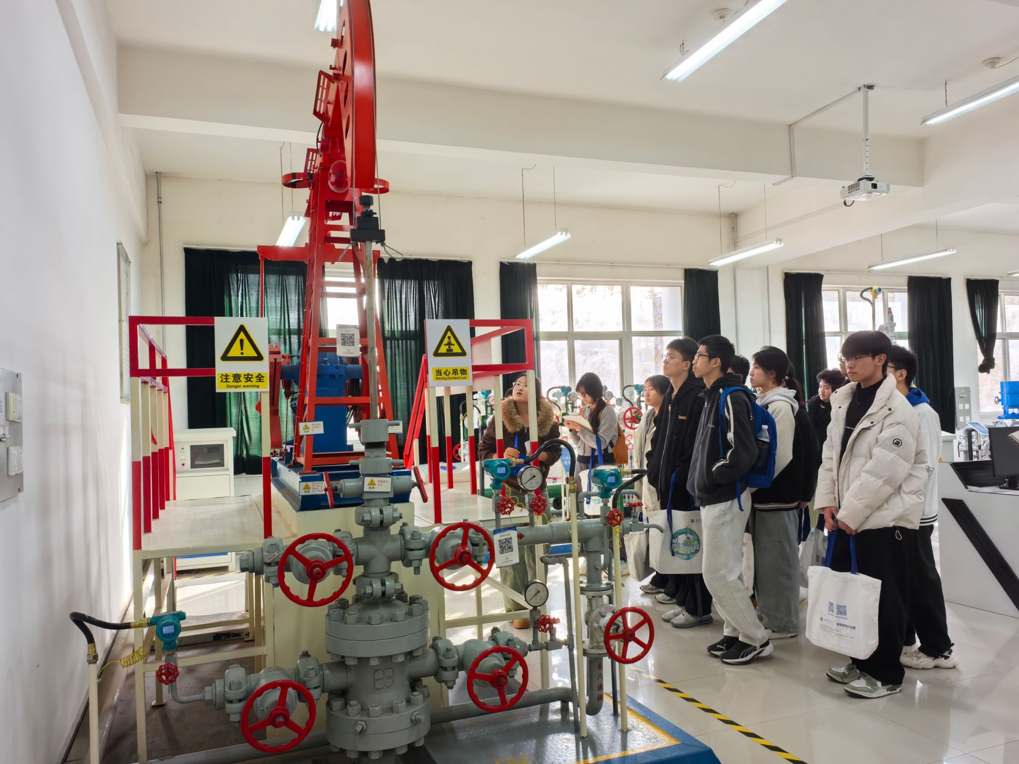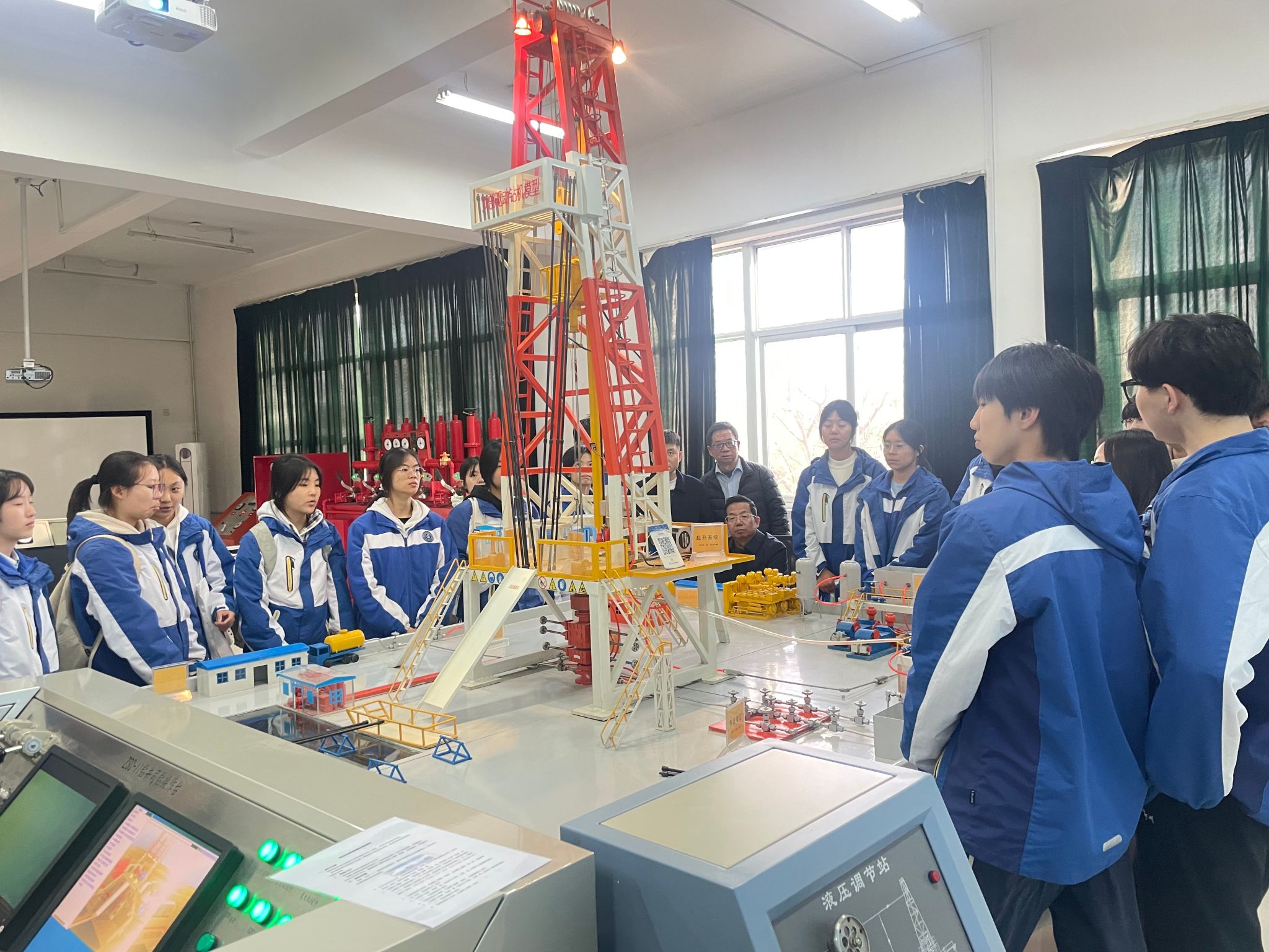 研学活动最后一站参观了beat365陕西省石油石化虚拟仿真实验教学中心。在大学生讲解员的带领下,五高师生参观了钻井实训室、地质标本实训室、采油实训室、油气分布沙盘、集输、炼化实训室、采油实训室。通过参观学习,学生初步了解了石油勘探、开采、炼化和运输的全过程,近距离感受到了石油石化及地质行业的魅力与挑战。