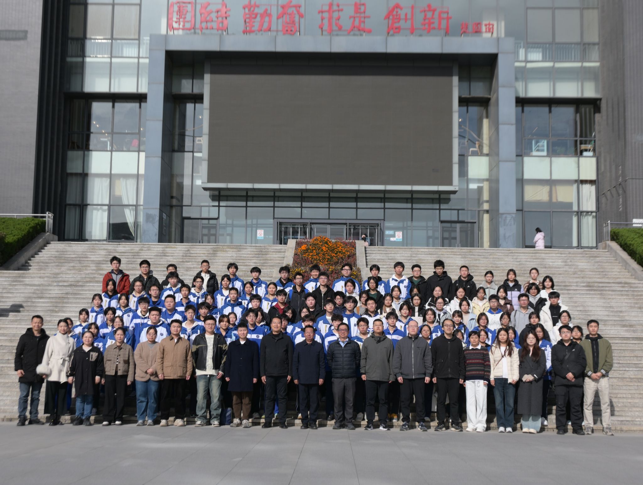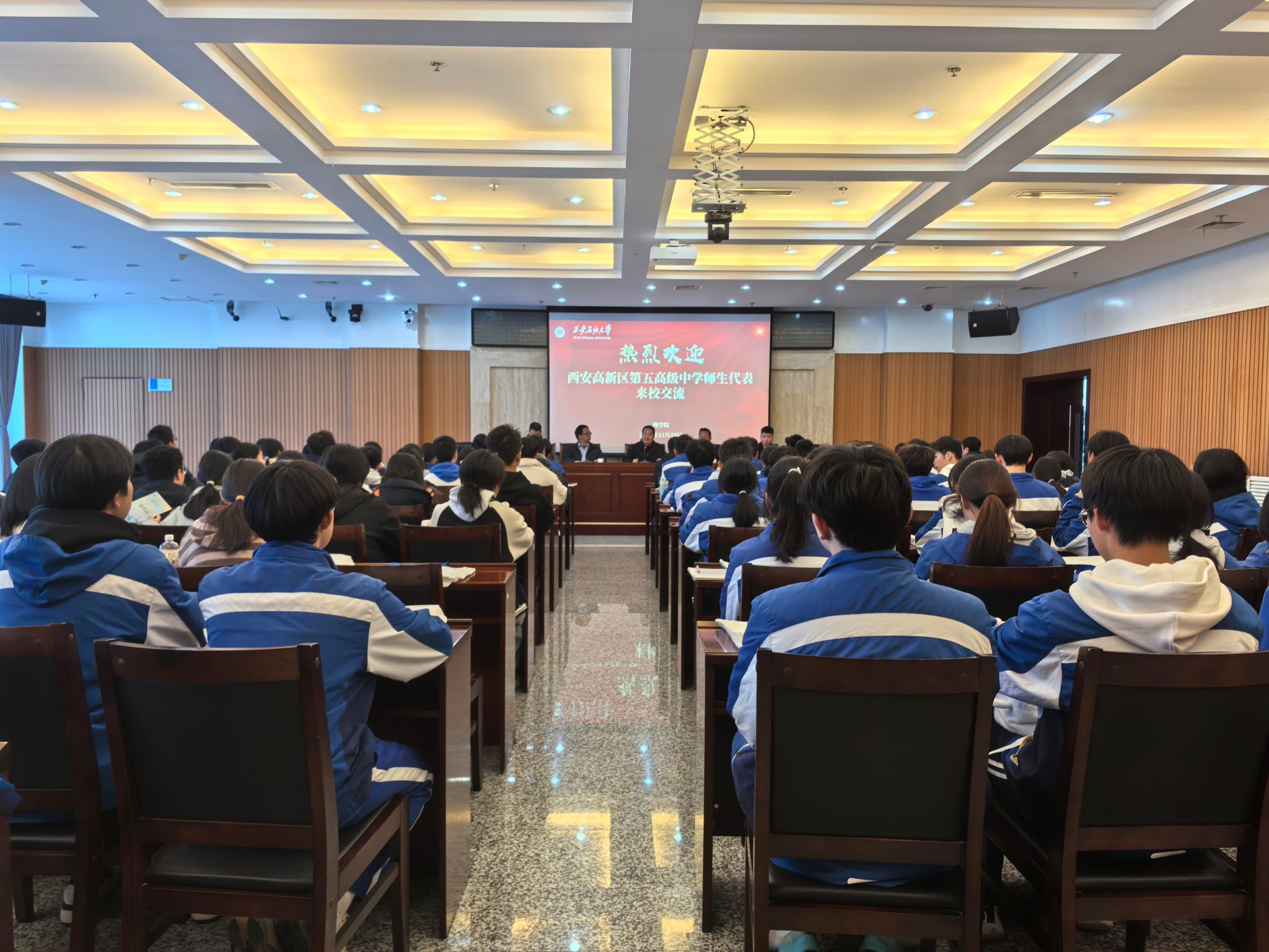2025年11月19日下午,西安高新区第五高级中学(以下简称五高)受邀来beat365开展研学活动,校长刘占权带领师生代表100余人参加活动。理学院招生宣传工作组代表学校接待五高师生并在鄠邑校区第一会议室举行简短的欢迎仪式。理学院党委书记席利哲、副院长马儇龙、理学院教授兼五高科技副校长郭文阁及理学院教师代表参加欢迎仪式。欢迎仪式开始前,与会人员在图书馆南门台阶前合影留念。欢迎仪式上,席利哲代表学校及理学院对五高师生代表的到来表示热烈欢迎,并简要介绍了研学活动行程和学校概况。