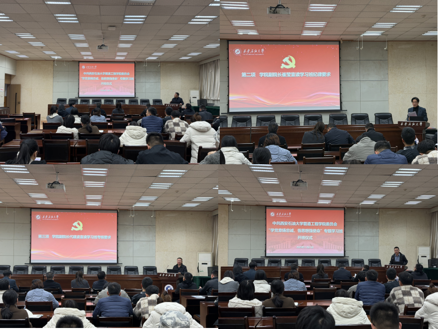 为深入学习贯彻党的二十届四中全会精神,落实学校第三次党代会精神,全面提升基层党组织建设质量,强化二级学院的政治属性和育人责任,促进党建和中心工作融合互促,重点提升教师特别是党员教师在教学、科研、管理和学习中的模范带头作用,结合深入贯彻中央八项规定精神学习教育工作安排,11月21日,管道工程学院党委在雁塔校区第三会议室举办了“学党章铸忠诚,悟思想强使命”专题学习班开班仪式,学院班子全体成员、全体教职工、研究生党员代表参加了会议。学院学生工作办公室主任孙剑秋主持会议。