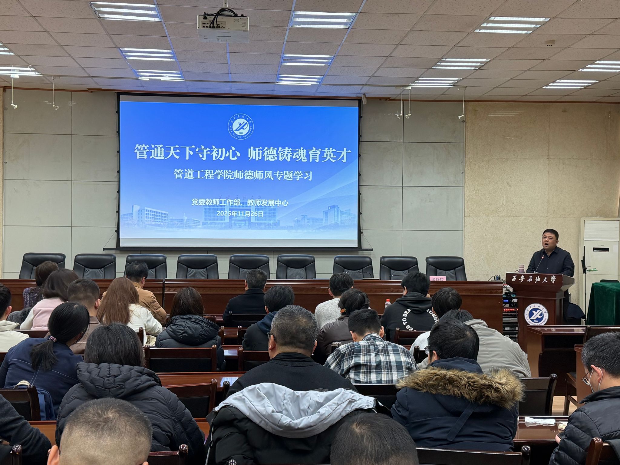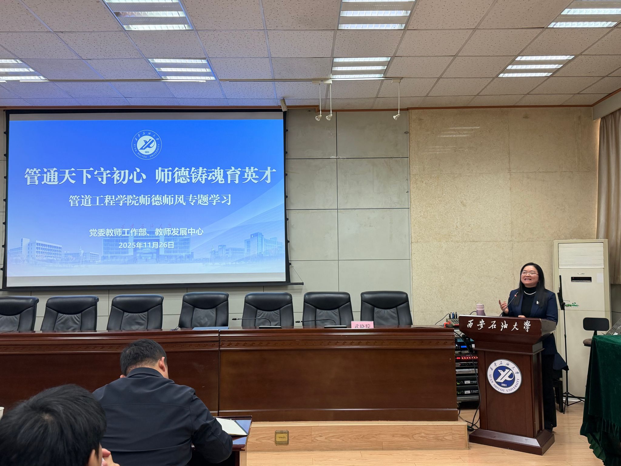 11月26日下午,由管道工程学院党委主办的“学党章铸忠诚,悟思想强使命”专题学习班第一讲在雁塔校区西阶第三会议室举行。校党委教师工作部部长、教师发展中心主任武晓朦教授担任主讲,主讲题目为“管通天下守初心 师德铸魂育英才”,学院全体教职工及研究生代表参加学习。会议由学院党委副书记高亮主持。