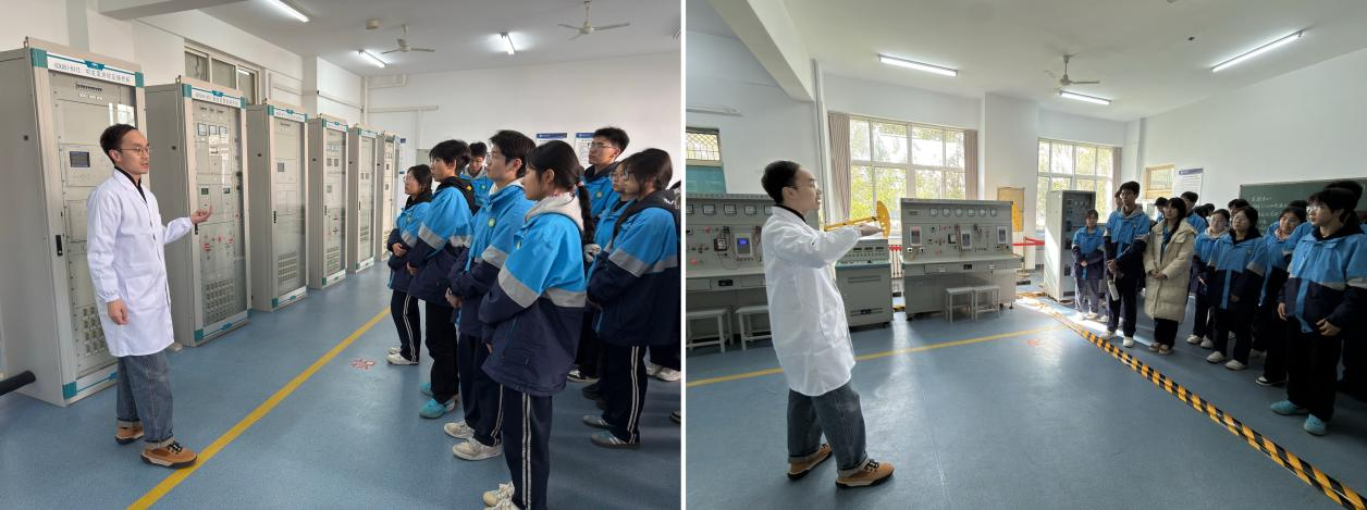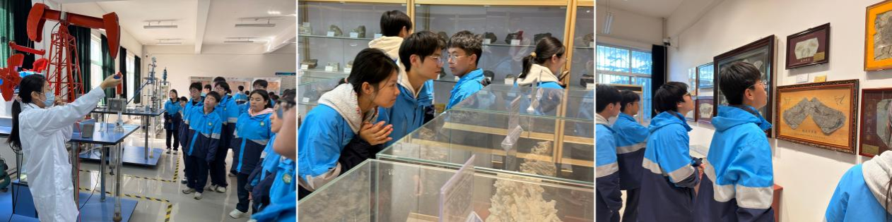 随后,中学师生前往电子工程学院电气工程及其自动化实验室和石油科普基地进行实地参观,大家依次参观了电力系统综合实验室、电力系统调度及仿真实验室、钻井实训室、地质标本实训室、采油实训室等多个实践教学场所,近距离观摩了油气分布沙盘、集输炼化设备等教学模型。通过讲解员的细致解说,同学们对石油勘探、开采、加工等环节有了更加直观的认识,也对现代石油工业的技术发展与实践应用产生了浓厚兴趣。