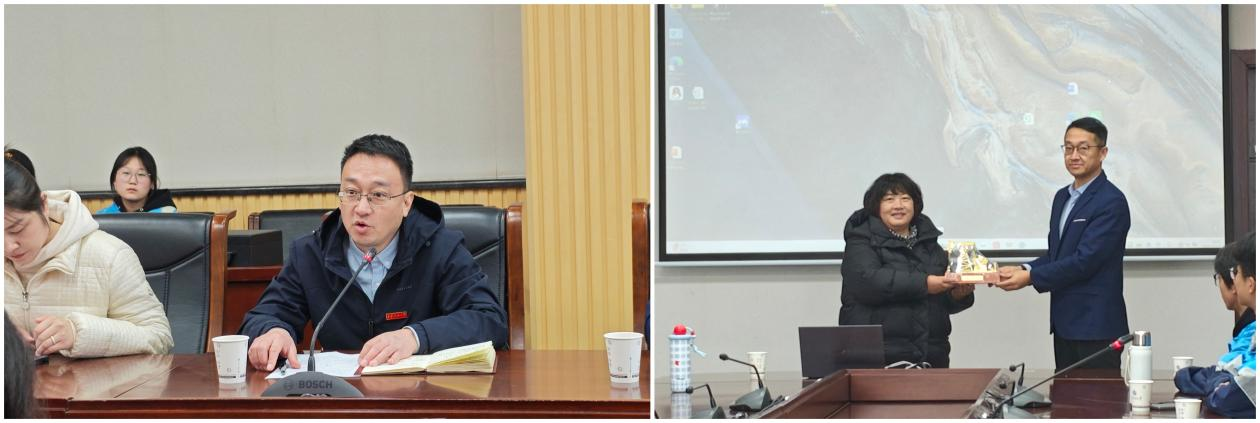 上午10时,活动在图书馆东门阶梯合影中拉开序幕。在图书馆第二会议室,大家共同观看beat365英国官方网站宣传片,全面了解学校的发展历程、学科特色与育人成果。在欢迎仪式上,电子工程学院教学副院长任志平致欢迎辞,对岳庙高级中学师生的到来表示热烈欢迎,并简要介绍了学院的基本情况与办学优势。随后,电子工程学院党委副书记芮执根代表学院向中学师生赠送抽油机模型,象征着石油工业精神的传承与两校友谊的延续。