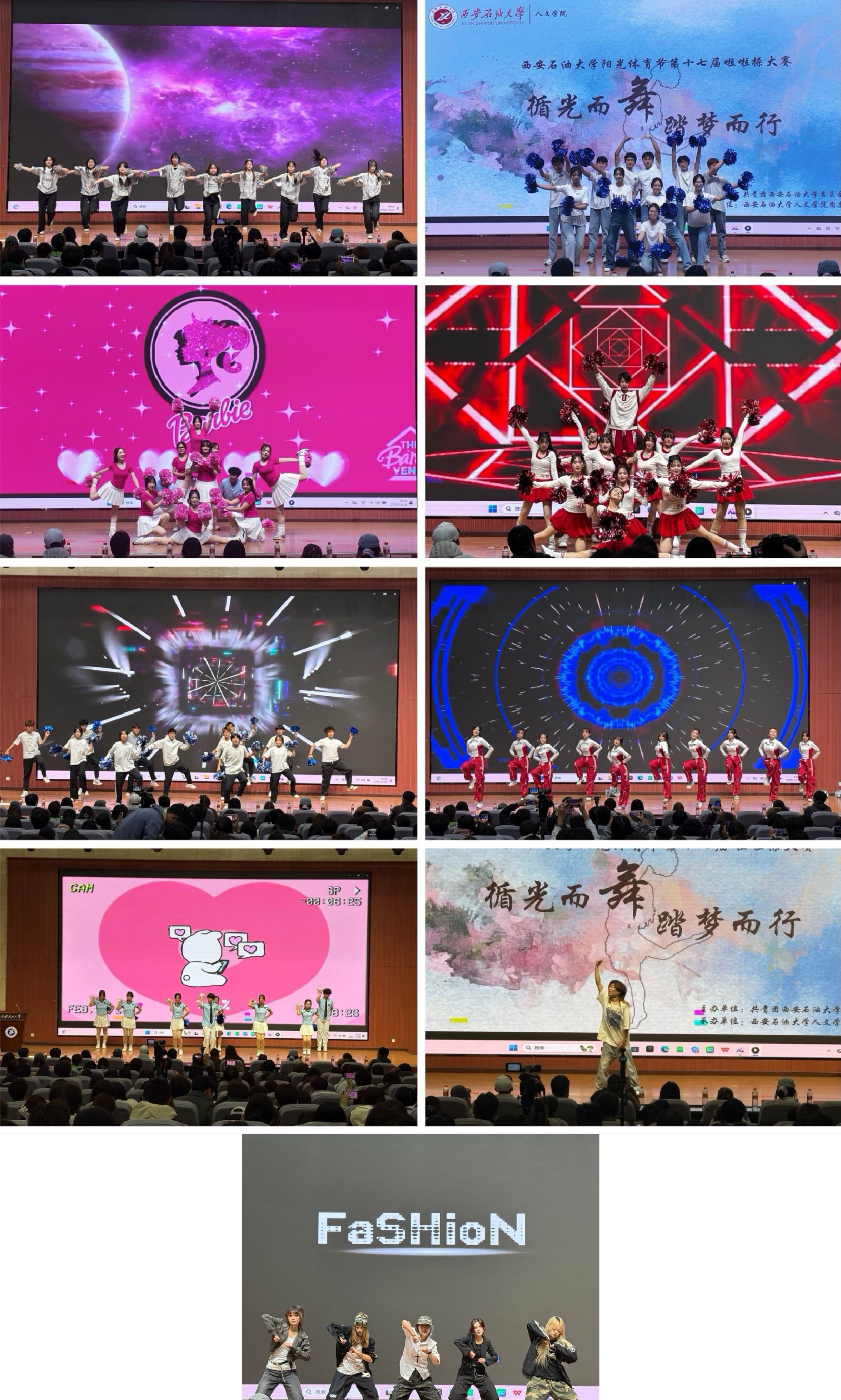 各学院代表队巧妙融合专业特色与舞蹈编排,以富有创意的表演展现健康体魄与积极向上的精神面貌。中场及结尾表演环节,人文学院郝振宇同学与梦舞时空街舞协会也带来了精彩演出,将现场气氛推向高潮。整场比赛不仅展现了高水平的竞技表现,也彰显了各学院和学校团结奋进的精神风貌。