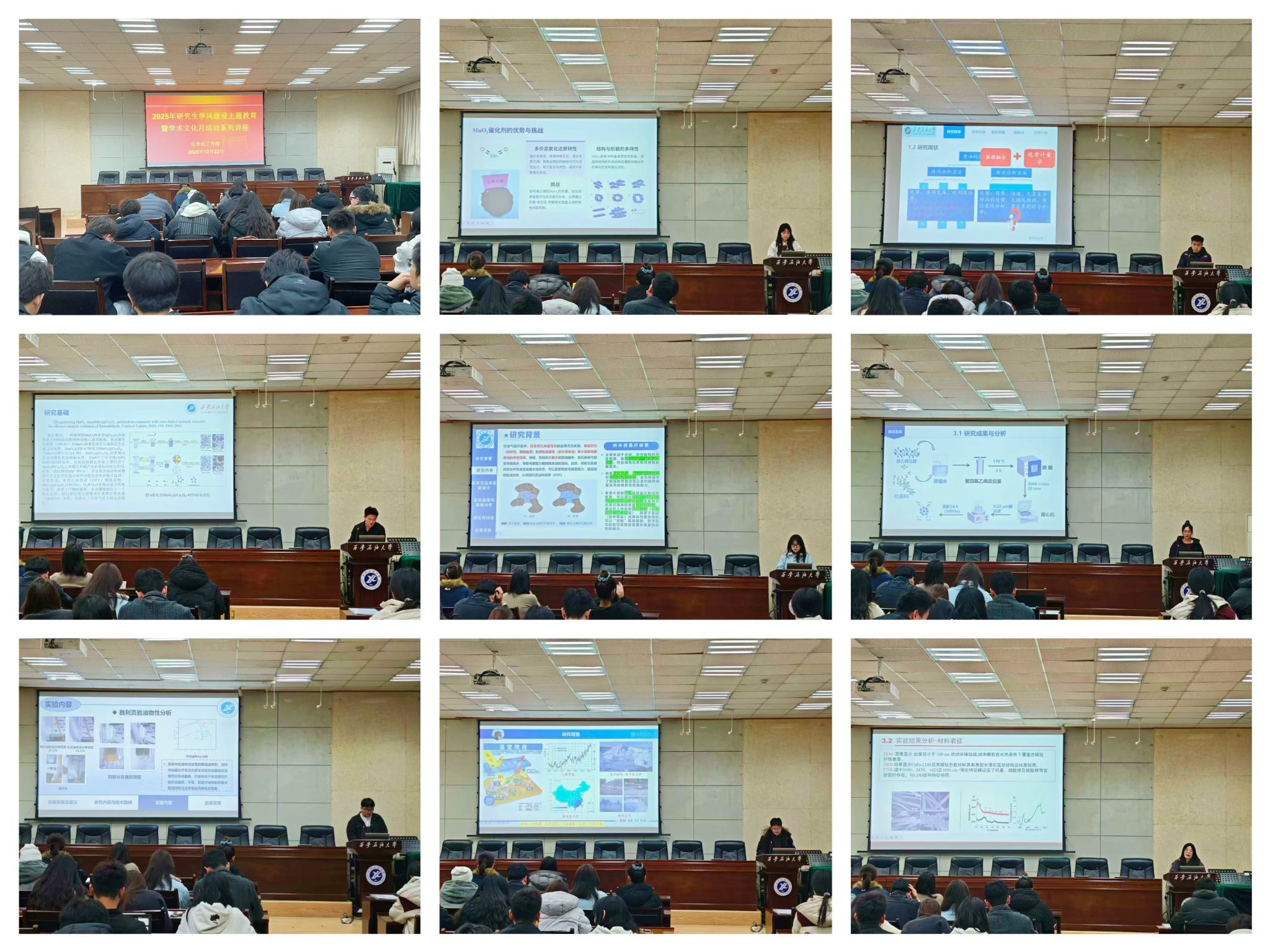 为持续强化学风引领,营造求真务实、开拓创新的学术氛围,根据学校研究生工作部关于2025年研究生学风建设暨学术文化活动月的安排部署,12月22日下午,化学化工学院在雁塔校区会议中心第三会议室成功举办2025年研究生学术文化月第二场学术报告。本场活动中,8位优秀研究生围绕能源催化、环境治理、功能材料等前沿领域作学术汇报,充分展现了扎实的学科素养与活跃的科研思维。学院专业教师于旭莹、刘瑞,综合办公室秘书冯旭亮,研究生辅导员曹勃及各年级研究生代表参会。