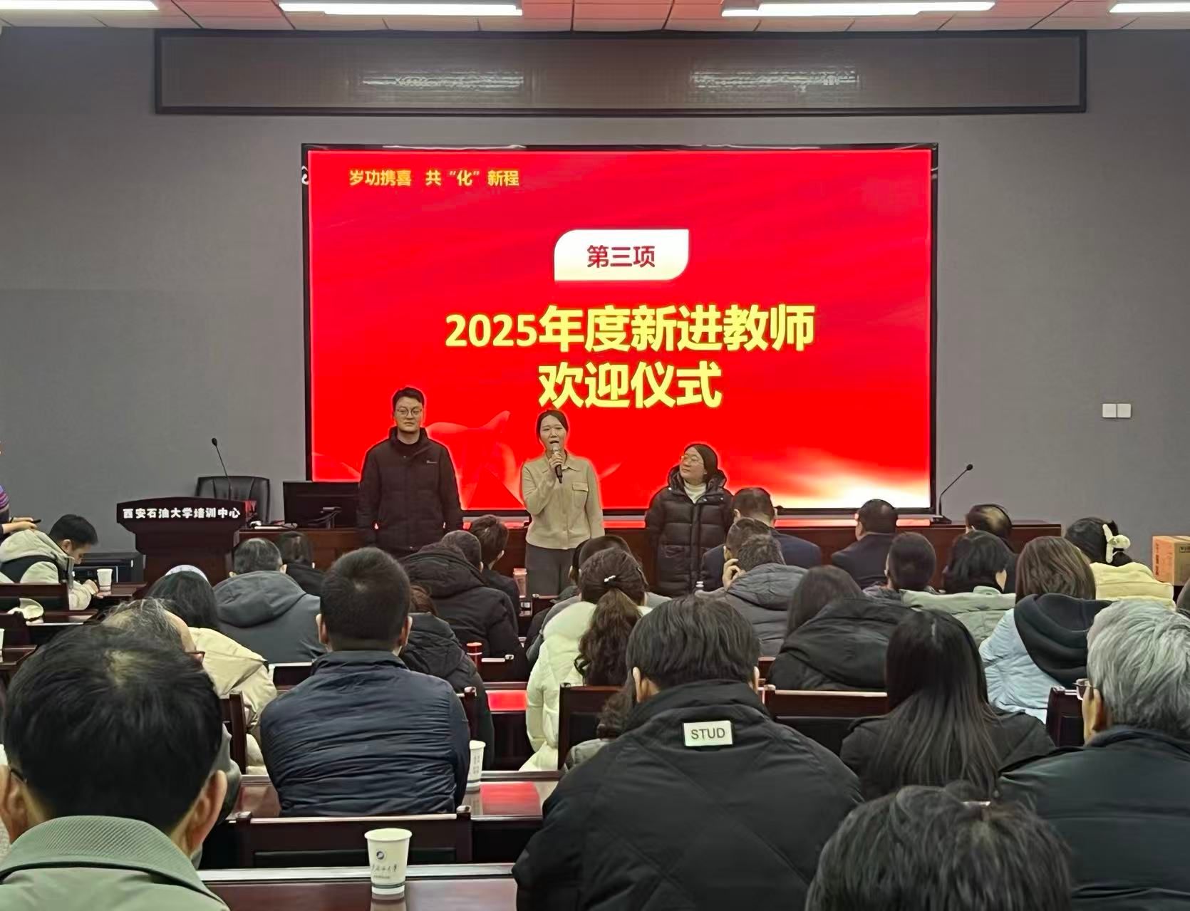 大会第四项为2025年新进教师的欢迎仪式。新引进的博士教师代表肖佳轩、于旭莹、韩晓琨分别发言。他们表达了自己尽快适应新角色、融入新集体的决心,并表示将自觉传承学院严谨治学、潜心育人的优良传统,握紧立德树人、科学研究的“接力棒”,充分发挥专业特长,积极投身学院的内涵建设与高质量发展,为学校建设高水平教学研究型大学的奋斗目标贡献智慧与力量。