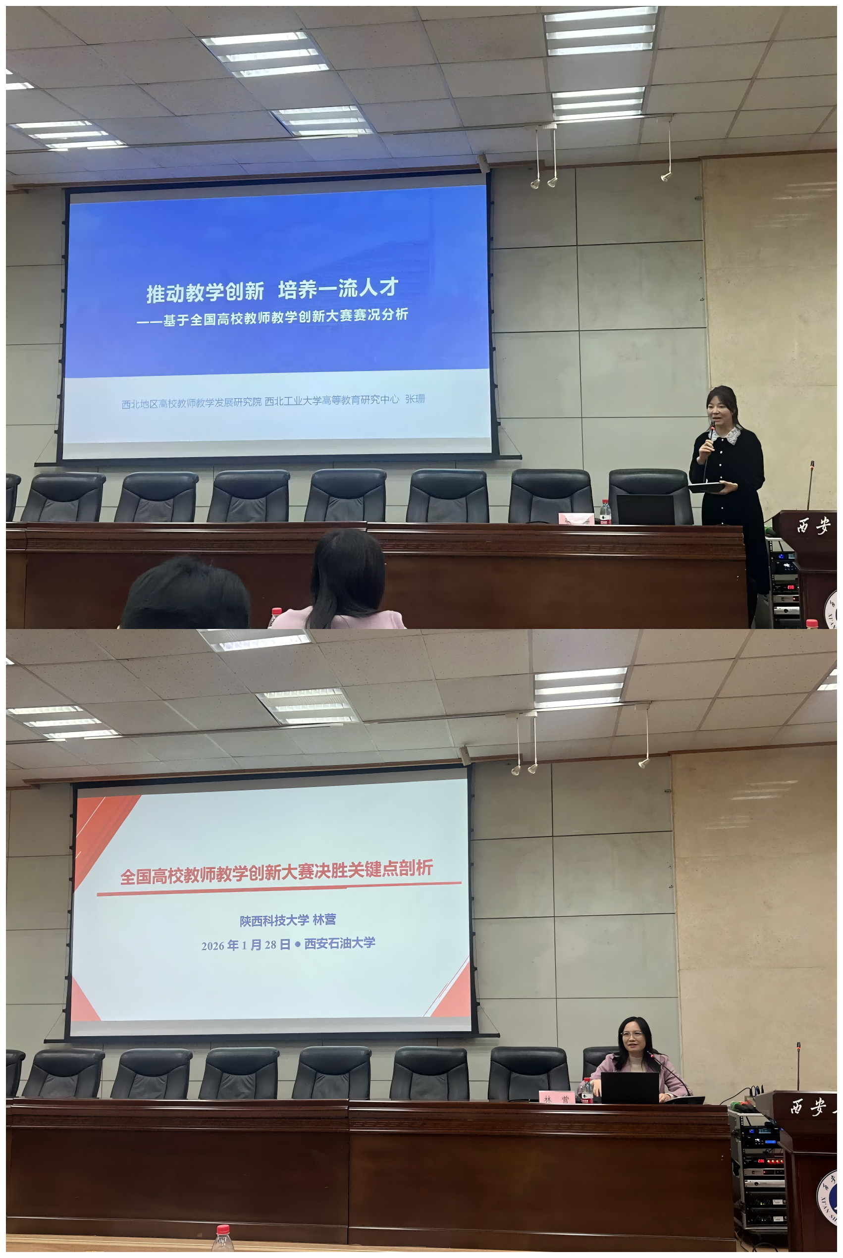 随后,两场专题报告为在场教师带来了前沿教学创新思路。西北工业大学张珊老师以《推动教学创新 培养一流人才—基于全国高校教师教学创新大赛赛况分析》为题,结合全国赛事最新动态,深入剖析了当前教学创新的趋势与方向,用鲜活案例展现了创新教学对人才培养的赋能作用;陕西科技大学林营教授作为全国高校教师教学创新大赛一等奖获得者,以《全国高校教师教学创新大赛决胜关键点剖析》为主题,从参赛材料打磨、课堂教学设计、成果展示技巧等核心环节入手,分享了备赛过程中的实战经验与避坑指南,为教师们精准发力提供了宝贵借鉴。