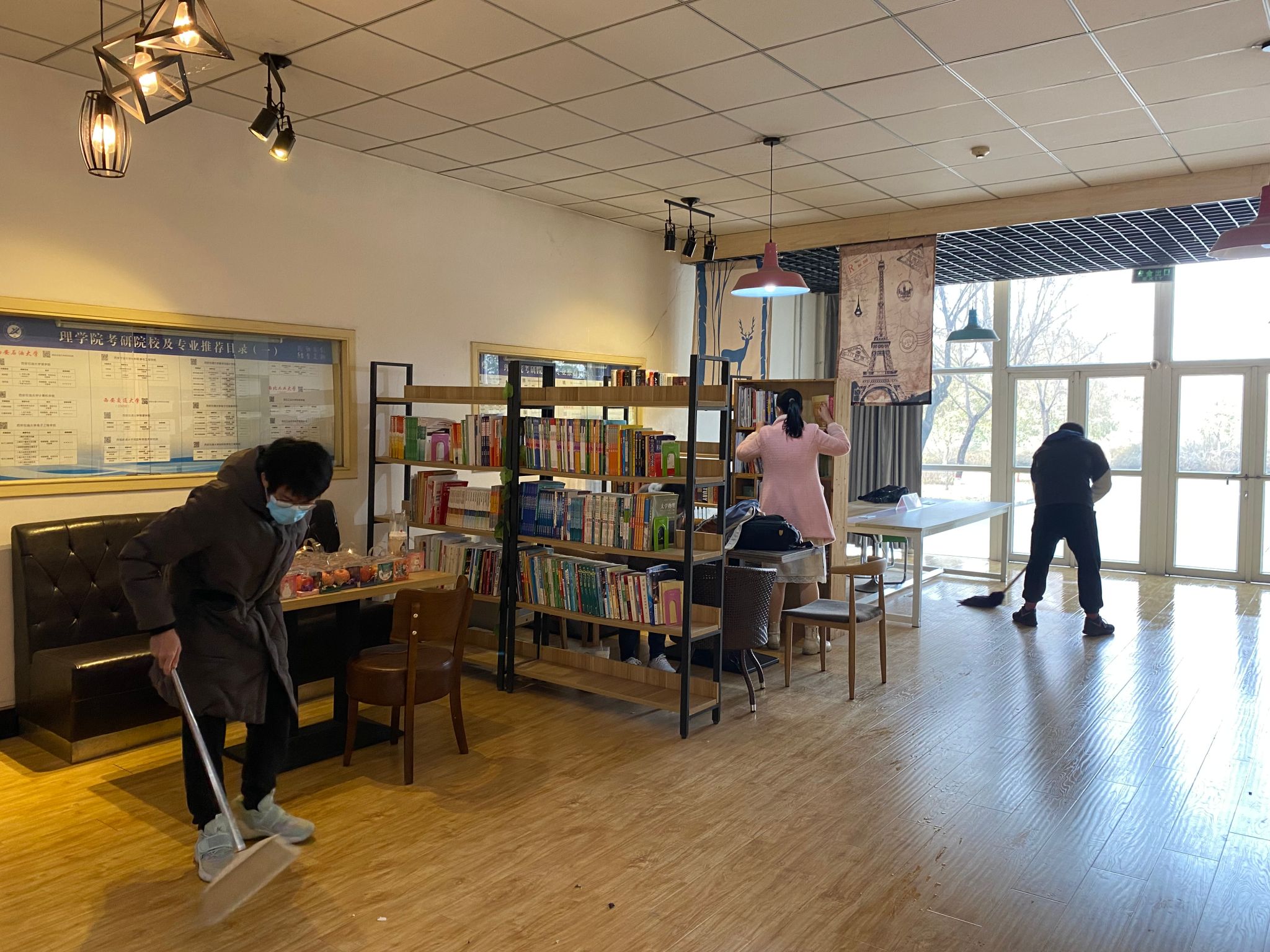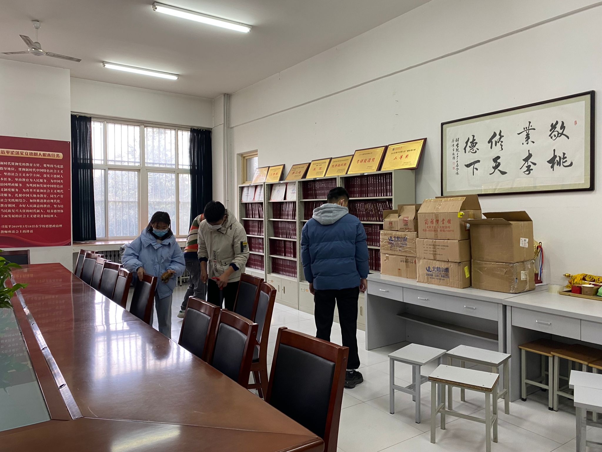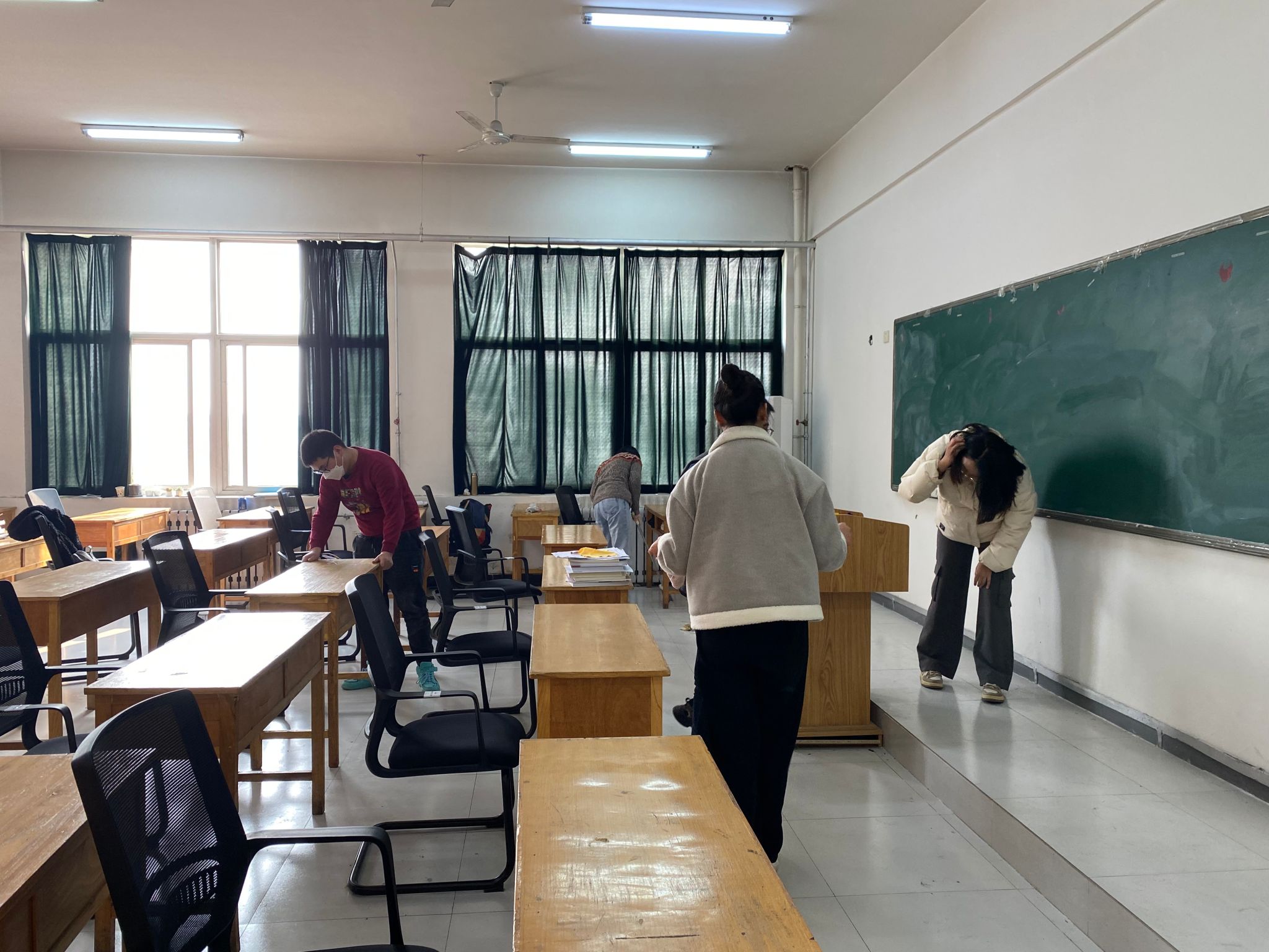 志愿者们在学院团委书记庞波老师的统筹安排下分成四个小组,分别奔赴不同的责任区域。在考研自习室,志愿者们仔细擦拭书桌、座椅,认真清扫地面的纸屑、灰尘,还贴心地为备战考研复试的学长学姐整理了散乱的书籍资料;实验室里,志愿者们小心翼翼地擦拭实验仪器,清理实验台的试剂残留;社团活动室和会议室里,志愿者们干劲十足地扫地、拖地、整理桌椅,不放过任何一个卫生死角。经过近几天的辛勤劳动,原本略显杂乱的环境变得焕然一新、整洁有序。