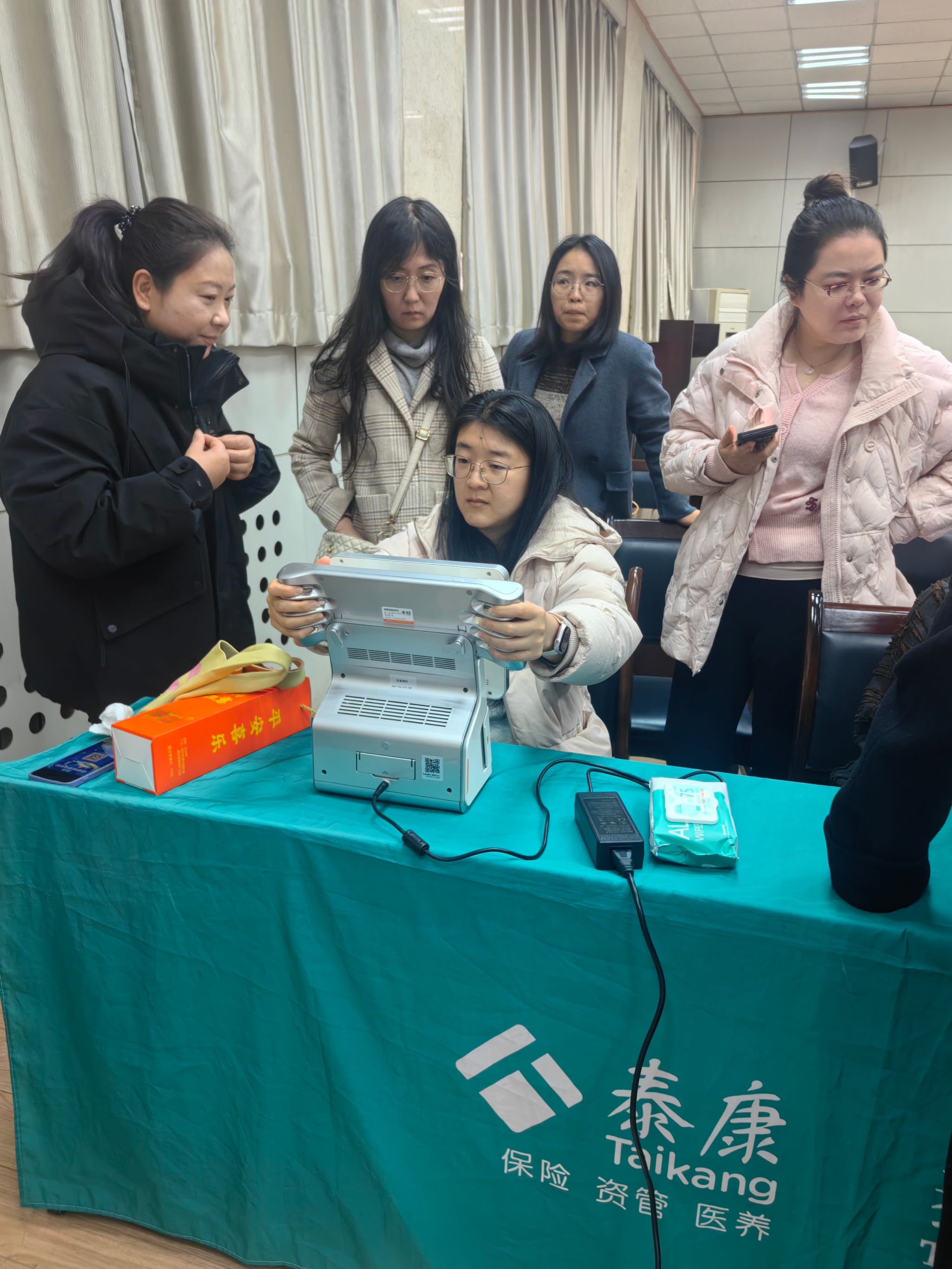 活动中,泰康养老陕西分公司教育行业服务负责人姬杰详细介绍了本次专属福利和服务内容,涵盖了个性化的健康咨询、高品质的医康养体验以及针对性的养老规划方案,力求让女教职工享受到更优质、更贴心的福利保障服务;现场的教职工们也在医疗仪器上进行了深度体验。