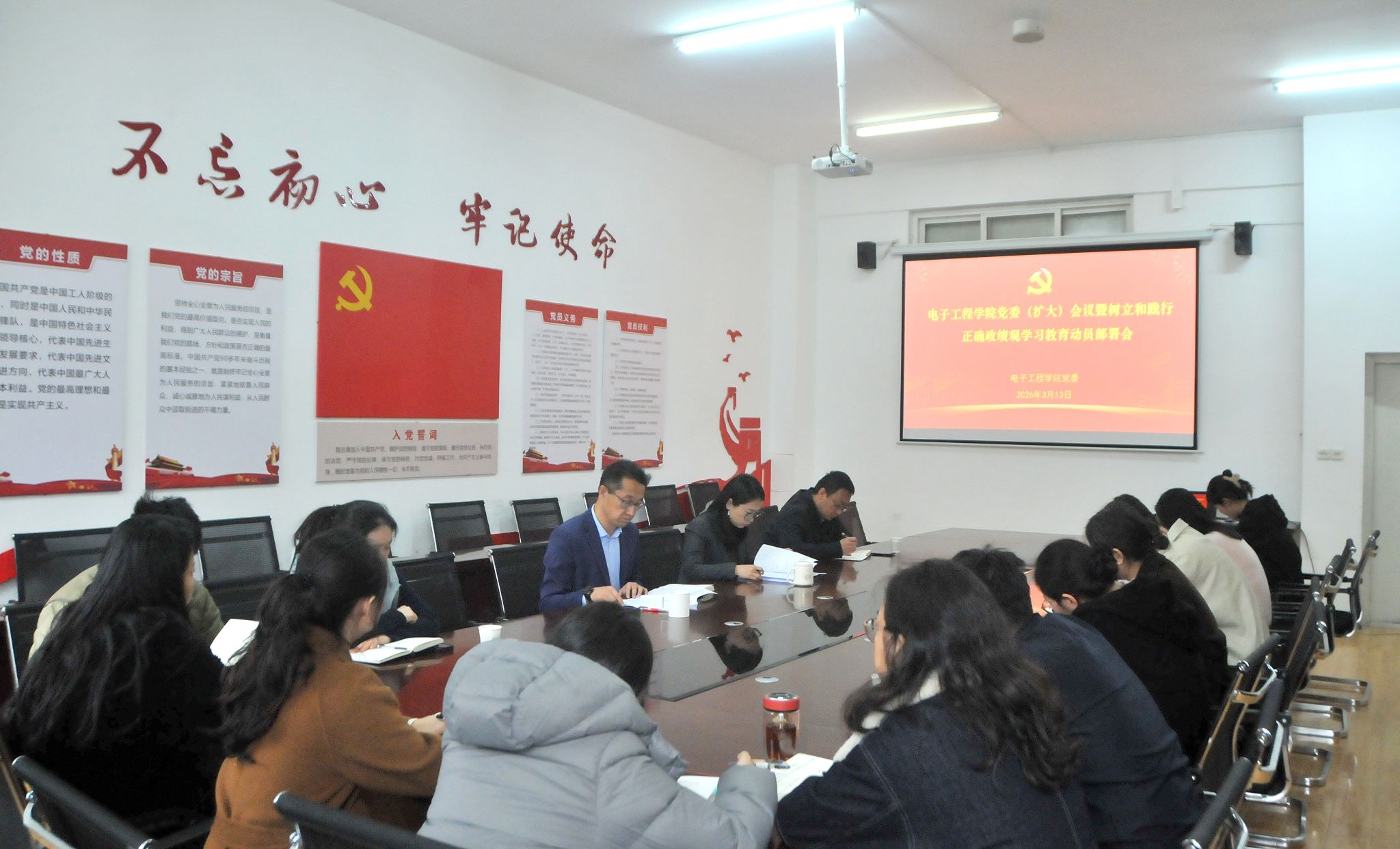 3月13日下午,电子工程学院在鄠邑校区行知楼321会议室召开党委(扩大)会议暨树立和践行正确政绩观学习教育动员部署会,认真学习贯彻习近平总书记关于在全党开展树立和践行正确政绩观学习教育的重要指示,传达学习学校党委相关会议精神,启动部署学院学习教育工作。学院党委书记潘娜主持会议学院党委委员、各党支部书记参加会议。