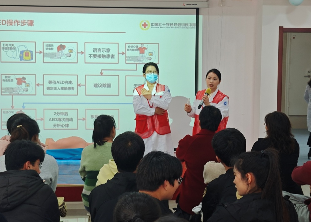 校医院副院长李文霞强调,应急救护是守护生命的“最后一道防线”,熟练掌握规范急救技能,对保障校园安全、高效应对各类突发状况具有至关重要的意义。目前,学校已实现多校区AED设备全域覆盖布设,本次培训是完善校园急救体系、织密校园安全防护网的关键一环。她希望全体学员珍惜学习机会,切实将所学知识转化为守护生命的实战能力,主动担当校园安全“第一响应人”。