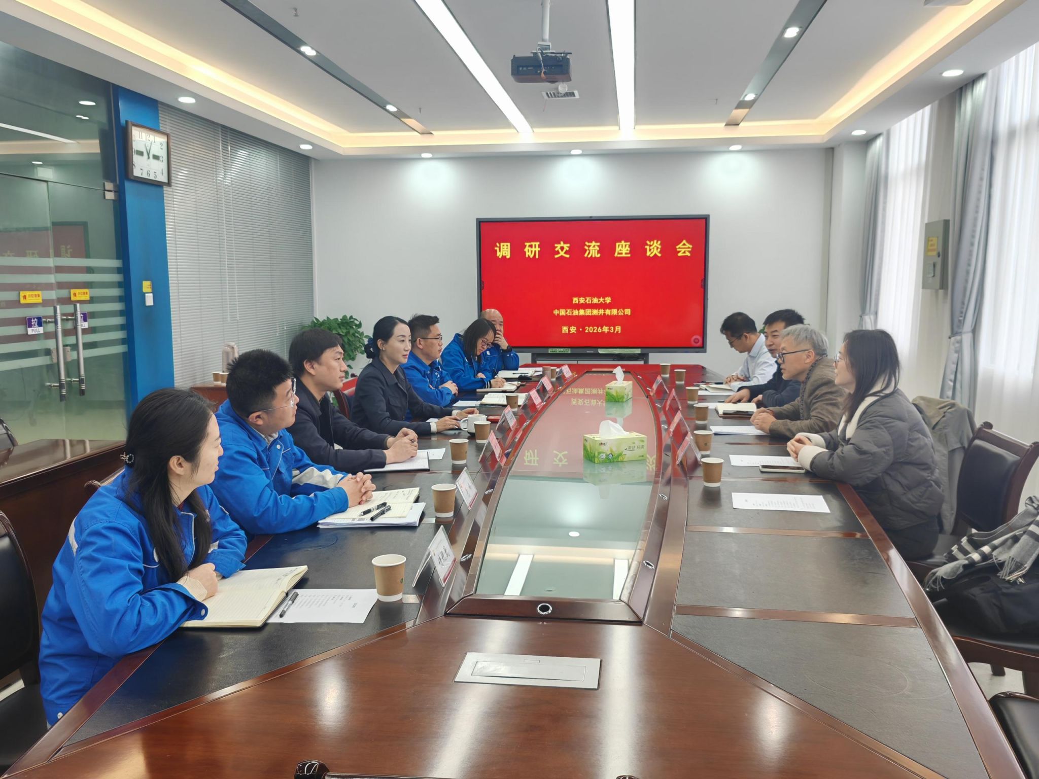 3 月 19 日上午,石油工程学院与电子工程学院联合组团,赴中国石油集团测井有限公司开展走访调研。中油测井制造公司党委书记方抒睿,中国石油集团测井有限公司人力资源部资深高级主管付浩等参加座谈交流。双方围绕科研协同攻关、人才联合培养、学生就业与实习实践、校企党建共建及员工业务培训等议题深入交流,就进一步拓展合作领域、丰富合作形式达成广泛共识。