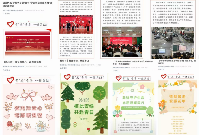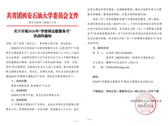 校团委高度重视,结合学校年度工作要点与育人实际,于3月5日印发《关于开展2026年“学雷锋志愿服务月”活动的通知》(西石大团发〔2026〕3号),对全年特别是3月份的学雷锋志愿服务工作进行了系统安排。《通知》明确了“服务重大战略、践行为民宗旨、深入基层治理、融汇学科优势、厚植校园沃土”五大活动方向,为全校活动开展提供了清晰指引。各院(系)团委、各级学生组织迅速响应,结合学科专业特色,制定了具体可行的实施方案,形成了校院联动、分工明确、责任到人的工作格局,确保了各项活动有计划、有步骤地扎实推进。