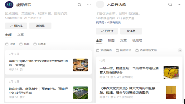 学院师生协同建设“术语有话说”“XSYU文思驿站”“能源译联”“华彩英绎”等4个特色公众号平台,累计发布推文3227篇,关注人数11787人次、总浏览量达340654次,持续拓展中国文化国际传播影响力。平台聚焦能源领域术语传播、国际工程跨文化案例解析、中国文化国际传播与学术语言服务能力建设,逐步构建起服务“一带一路”能源合作与学校国际化人才培养的融媒体语言服务体系,有效提升学校专业语言服务能力与国际传播能力。依托相关平台资源,学院积极服务学校国际教育学院留学生培养工作,承担“石油科技俄语”“石油科技俄语文献阅读”等课程教学任务,持续强化能源领域专业语言支撑能力,进一步彰显了学院在能源语言服务、跨文化传播与国际传播能力建设方面的特色优势与示范效应。