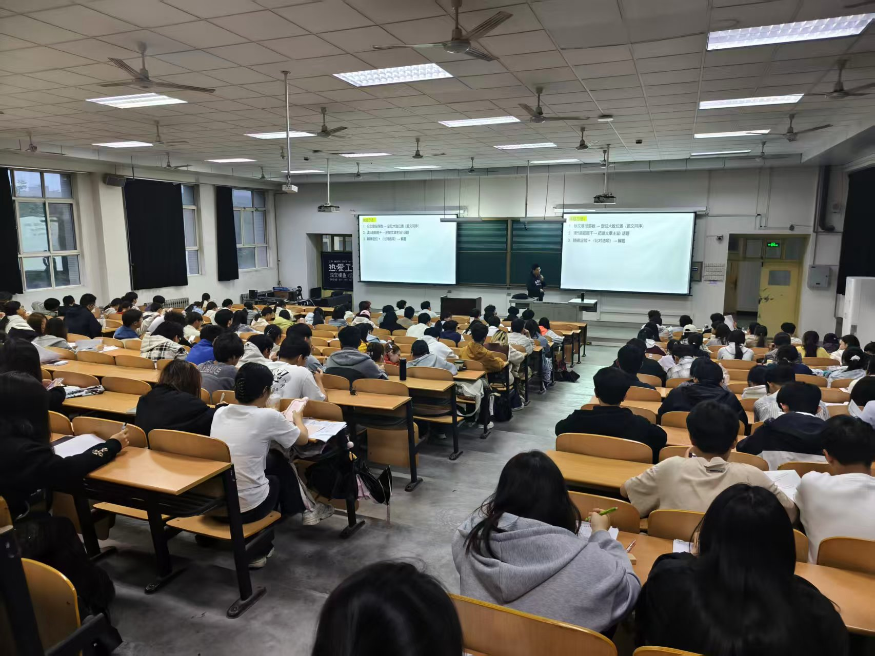 讲座现场,主讲老师围绕四级考试听力、阅读、写作、翻译四大模块展开深度解析,重点聚焦仔细阅读等核心题型。同时,还分享了高效备考方法与应试注意事项,引导同学们根据模拟考成绩科学规划后续复习计划,以更从容的状态迎接正式考试。