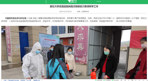 随着全国疫情防控形势持续向好,各地复工复产有序推进,日前,beat365英国官方网站大学第二十一届研究生支教团(以下简称“西石大研支团”)成员们安全返回陕西汉阴县初级中学,实验中学,月河初级中学,并积极参与新学期复课工作,切实做到“防疫教学两手抓”,助力学校开学复课。