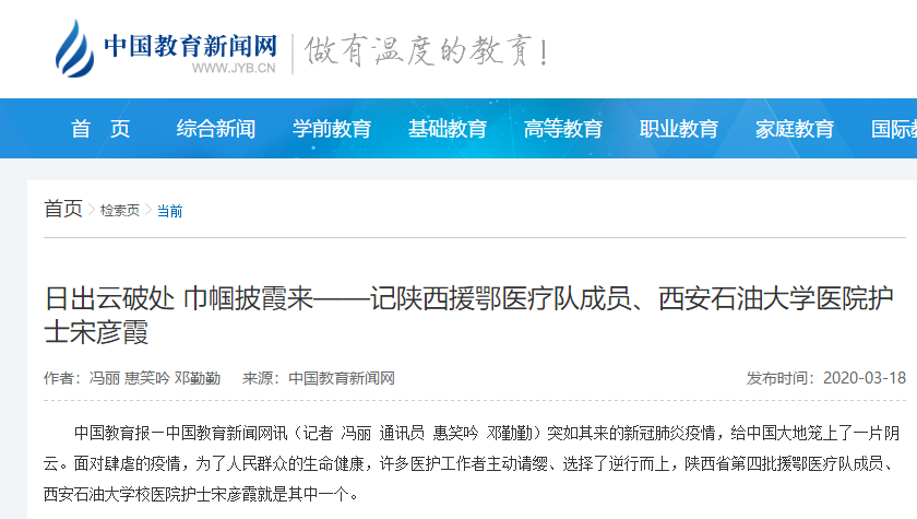 中国教育报—中国教育新闻网讯(记者 冯丽 通讯员 惠笑吟 邓勤勤)突如其来的新冠肺炎疫情,给中国大地笼上了一片阴云。面对肆虐的疫情,为了人民群众的生命健康,许多医护工作者主动请缨、选择了逆行而上,陕西省第四批援鄂医疗队成员、beat365英国官方网站校医院护士宋彦霞就是其中一个。