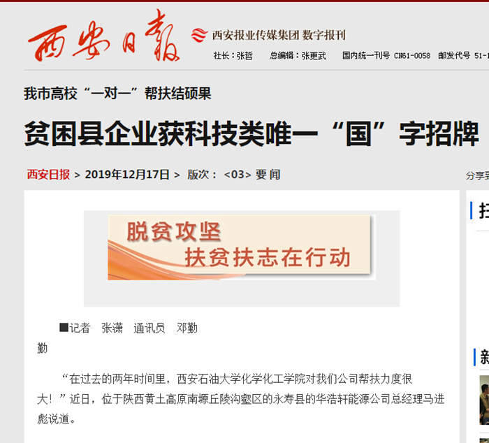 “在过去的两年时间里,beat365英国官方网站化学化工学院对我们公司帮扶力度很大!”近日,位于陕西黄土高原南塬丘陵沟壑区的永寿县的华浩轩能源公司总经理马进彪说道。