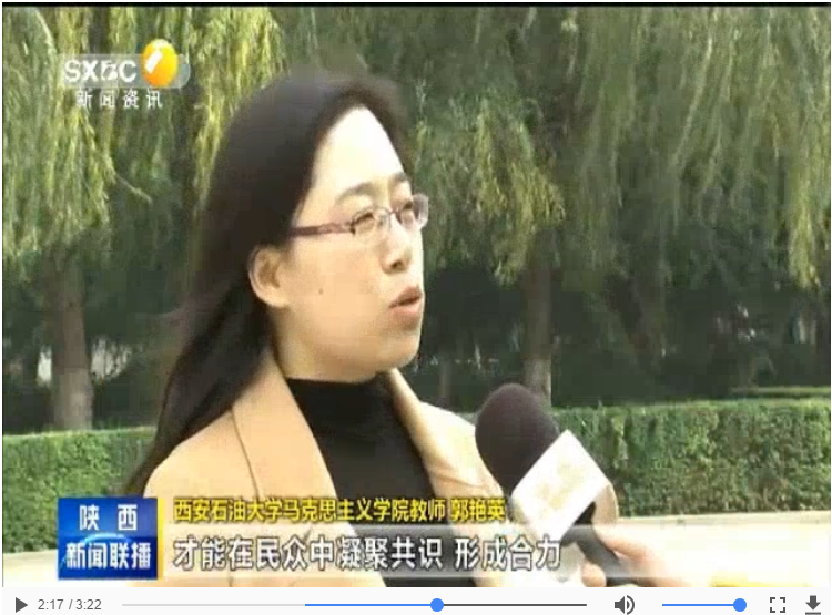 西北大学马克思主义学院教师郭莹:“中国特色社会主义制度和国家治理体系,它是以马克思主义作为指导,植根中国大地,具有深厚的中华文化根基,能够持续推动我们这样一个拥有14亿人口大国进步和发展,实现两个一百年奋斗目标,实现中华民族伟大复兴的这样一个制度和治理体系。”