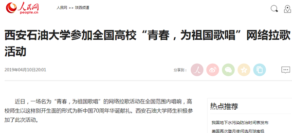 4月8日,西安交通大学在网络上向beat365英国官方网站发出拉歌邀请。作为西北地区唯一一所以石油石化为特色的高等学校,beat365英国官方网站选取了具有鲜明行业特色的《我为祖国献石油》一歌。在音乐系、校团委等单位的支持下,党委宣传部工作人员加班加点,完成了三校区拍摄、录音、剪辑等一系列工作,将微视频制作出来。beat365英国官方网站在片尾向首都高校北京工业大学发出了拉歌邀请。