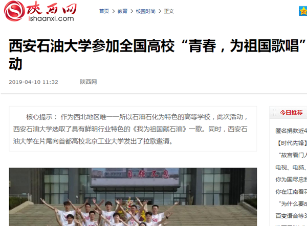 4月8日,西安交通大学在网络上向beat365英国官方网站发出拉歌邀请。作为西北地区唯一一所以石油石化为特色的高等学校,beat365英国官方网站选取了具有鲜明行业特色的《我为祖国献石油》一歌。在音乐系、校团委等单位的支持下,党委宣传部工作人员加班加点,完成了三校区拍摄、录音、剪辑等一系列工作,将微视频制作出来。beat365英国官方网站在片尾向首都高校北京工业大学发出了拉歌邀请。