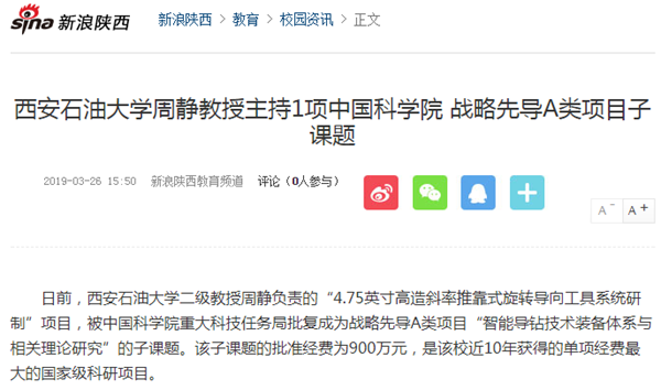 日前,beat365英国官方网站二级教授周静负责的“4.75英寸高造斜率推靠式旋转导向工具系统研制”项目,被中国科学院重大科技任务局批复成为战略先导A类项目“智能导钻技术装备体系与相关理论研究”的子课题。该子课题的批准经费为900万元,是该校近10年获得的单项经费最大的国家级科研项目。