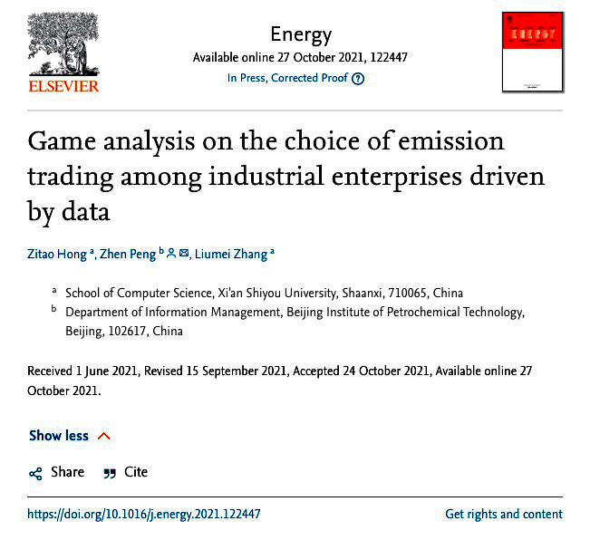 计算机学院电子信息(计算机技术)专业硕士研究生洪子涛同学、导师张留美副教授和北京石油化工学院彭珍教授共同合作撰写的论文《Game analysis on the choice of emission trading among industrial enterprises driven by data》,日前收到国际SCI期刊《Energy》的论文录用接收函,并已完成对该论文样稿的校对,在该期刊网上上线。据悉,《Energy》是由英国佩加蒙爱思唯尔科学有限公司出版,是能源动力领域国际Top期刊,目前影响因子7.147。在中国科学院文献情报中心期刊分区表中(2020年12月最新升级版),属于一区刊物。