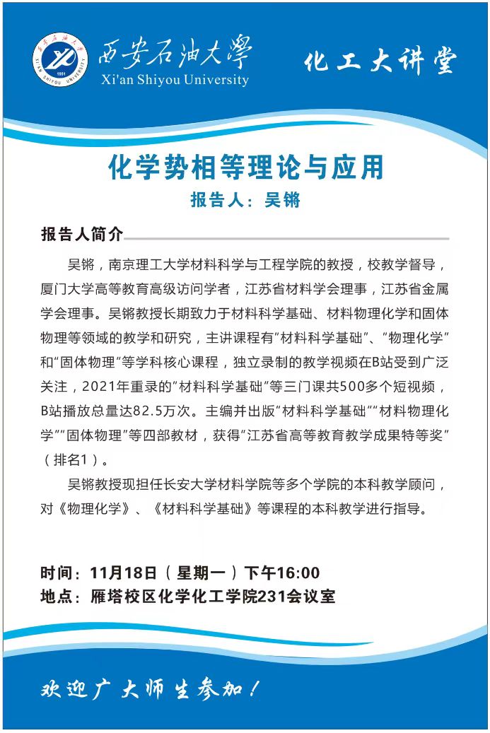 报告地点:雁塔校区化学化工学院231会议室